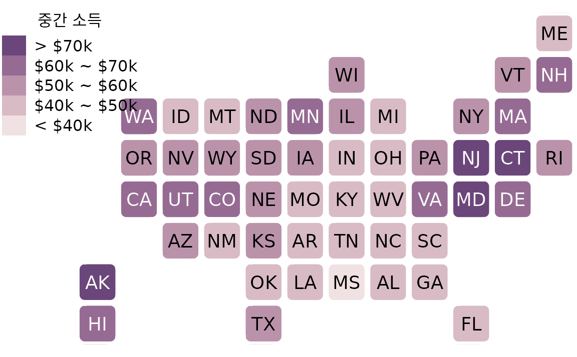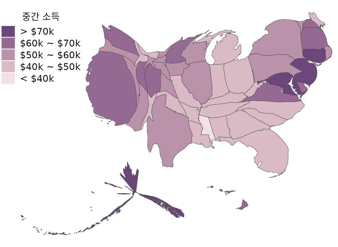모든 지도와 유사한 시각화가 유용하기 위해 지리적으로 정확해야 하는 것은 아닙니다. 예를 들어 그림 ?fig-median-income-states의 문제는 일부 주는 비교적 넓은 면적을 차지하지만 인구 밀도가 낮은 반면 다른 주는 작은 면적을 차지하지만 많은 주민이 있다는 것입니다. 주의 면적을 주민 수에 비례하도록 변형하면 어떻게 될까요? 이러한 수정된 지도를 카토그램이라고 하며 그림 ?fig-median-income-cartogram은 중간 소득 데이터 세트에 대해 어떻게 보일 수 있는지 보여줍니다. 개별 주를 여전히 인식할 수 있지만 인구 수에 대한 조정이 중요한 수정을 가져왔다는 것도 알 수 있습니다. 동부 해안 주, 플로리다, 캘리포니아는 크기가 많이 커졌지만 다른 서부 주와 알래스카는 축소되었습니다.