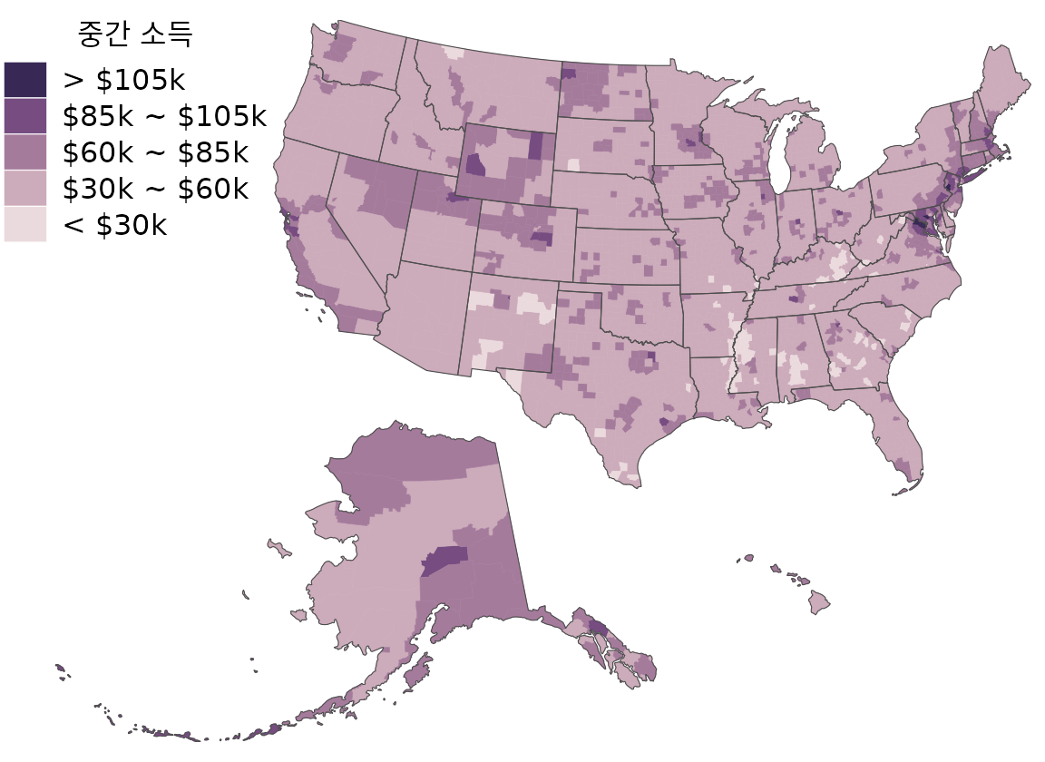 단계 구분도 매핑에서 연속적인 색상 척도와 이산적인 색상 척도의 효과를 고려하는 것도 중요합니다. 연속적인 색상 척도는 시각적으로 매력적으로 보이는 경향이 있지만(예: 그림 Figure 17.9 및 Figure 17.10), 읽기 어려울 수 있습니다. 우리는 특정 색상 값을 인식하고 연속적인 척도와 일치시키는 데 능숙하지 않습니다. 따라서 데이터를 뚜렷한 색상으로 표현되는 이산적인 그룹으로 나누는 것이 종종 적절합니다. 4~6개의 구간이 좋은 선택입니다. 구간화는 일부 정보를 희생하지만 반대로 구간화된 색상은 고유하게 인식될 수 있습니다. 예를 들어 그림 ?fig-median-income-counties-binned은 텍사스 카운티의 중간 소득 지도(그림 Figure 6.4)를 미국 전체 카운티로 확장하고 5개의 뚜렷한 소득 구간으로 구성된 색상 척도를 사용합니다.