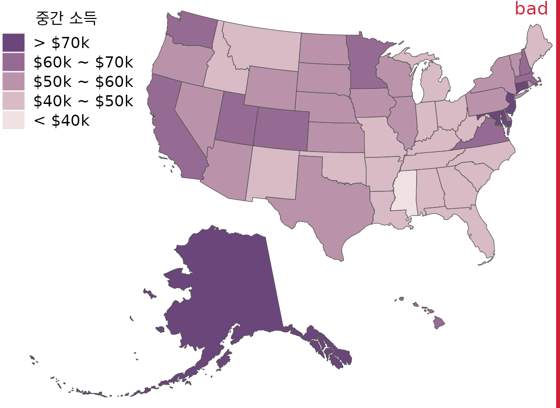 (ref:median-income-states) 미국의 모든 주의 중간 소득을 단계 구분도로 표시했습니다. 이 지도는 중간 소득은 높지만 인구 밀도는 매우 낮은 알래스카 주가 시각적으로 지배합니다. 동시에 동부 해안의 인구 밀도가 높은 고소득 주는 이 지도에서 그다지 두드러지지 않습니다. 종합적으로 이 지도는 미국의 소득 분포를 제대로 시각화하지 못하므로 “나쁨”으로 표시했습니다. 데이터 출처: 2015년 5개년 미국 지역사회 조사