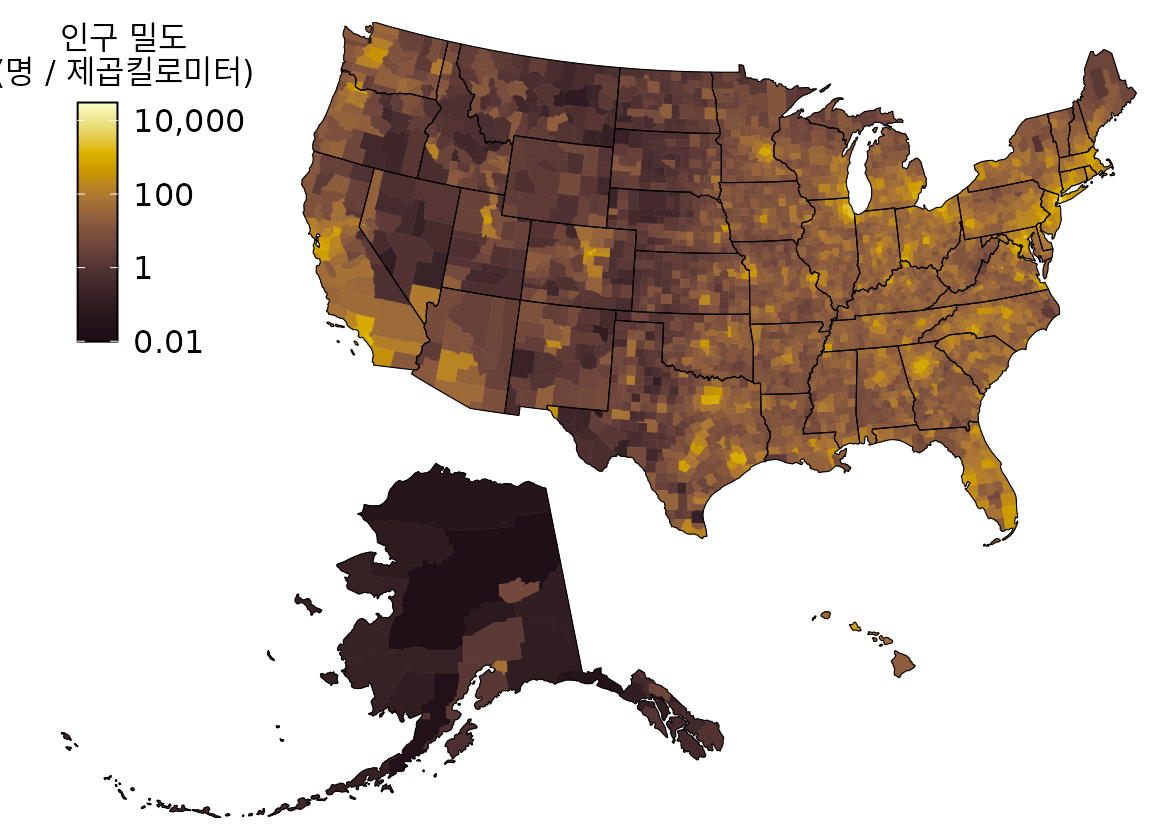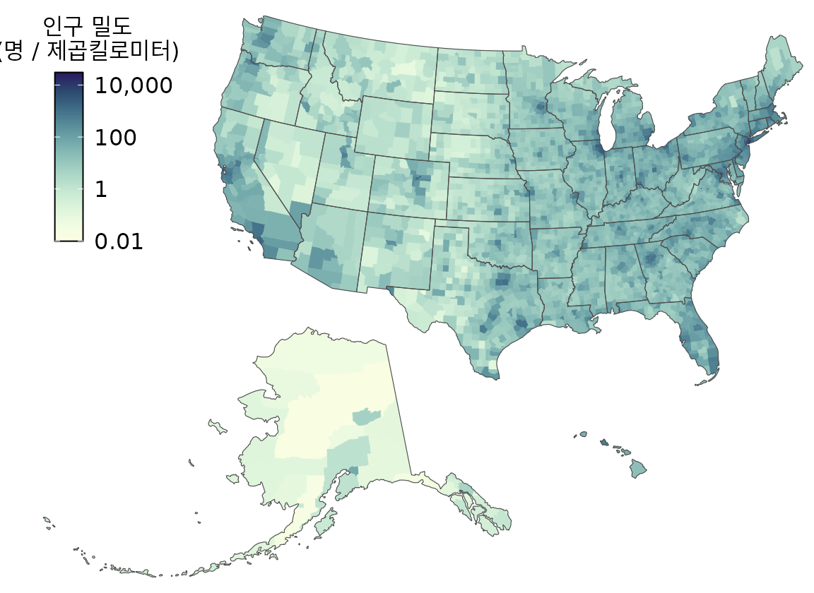 단순한 예로 미국의 카운티별 인구 밀도를 그려보겠습니다(그림 Figure 17.9). 인구수를 면적으로 나눈 밀도 값에 따라 색을 칠하면, 동부와 서부 해안의 대도시 지역은 진하게, 대평원과 알래스카 같은 곳은 연하게 표현됩니다. 이를 통해 인구가 어디에 집중되어 있는지 한눈에 알 수 있습니다.