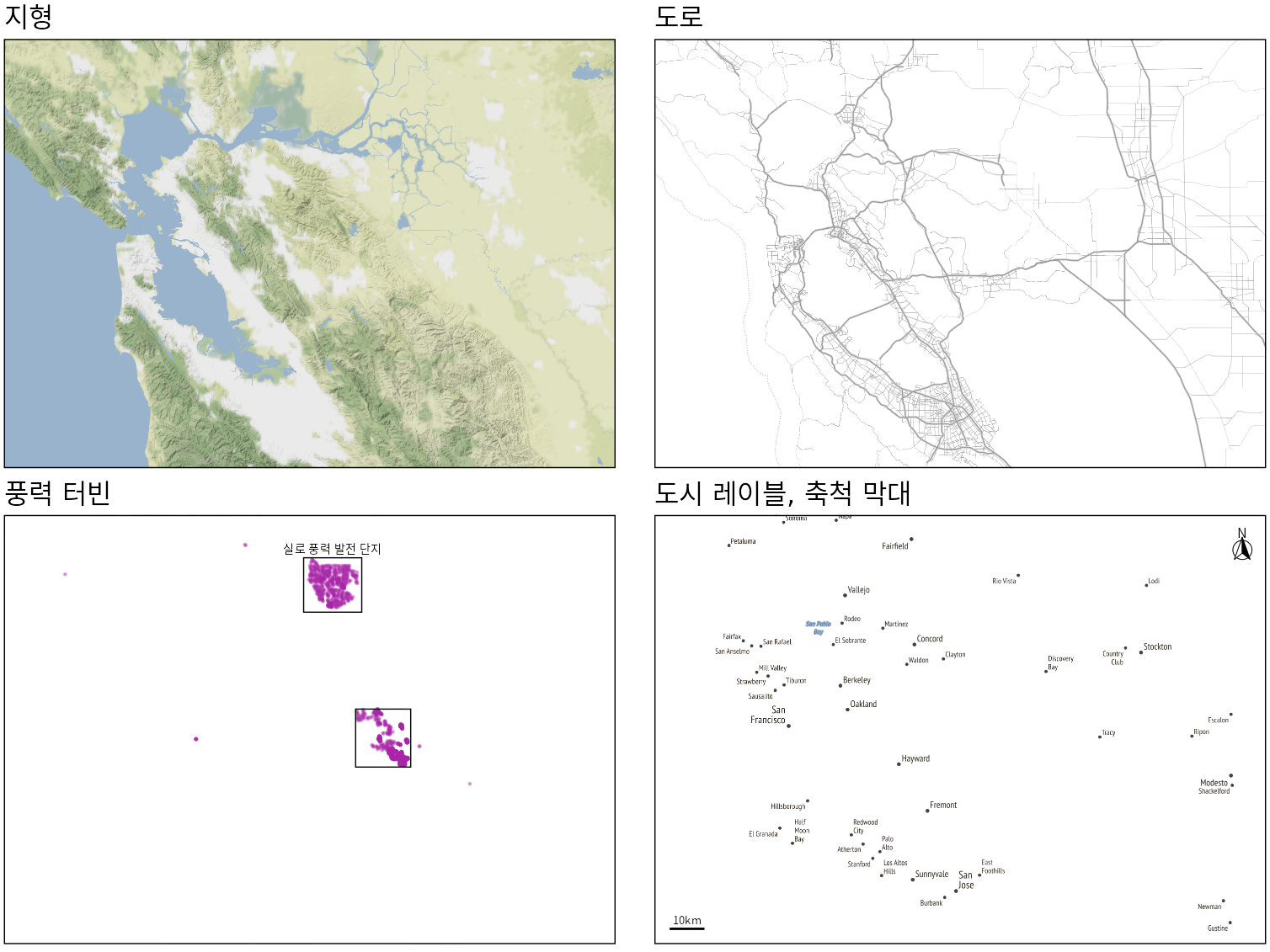 그림 ?fig-sfbay-overview는 네 개의 레이어로 이루어져 있습니다. 맨 아래 지형 레이어부터 도로망, 풍력 터빈 위치, 그리고 마지막으로 도시 이름과 축척 같은 안내 정보 레이어를 차례로 쌓은 것입니다(그림 Figure 17.7). 용도에 따라 필요한 레이어만 골라 쓸 수 있습니다. 가령 선거지도를 그릴 때 복잡한 지형 정보는 방해가 될 수 있습니다. 반면 건물 옥상의 태양광 패널을 분석한다면 정밀한 위성 이미지가 필수적일 것입니다. 지도를 만들 때는 독자가 거리감을 익힐 수 있도록 축척 막대를, 방위를 알 수 있도록 북쪽 화살표를 추가하는 것이 기본입니다.