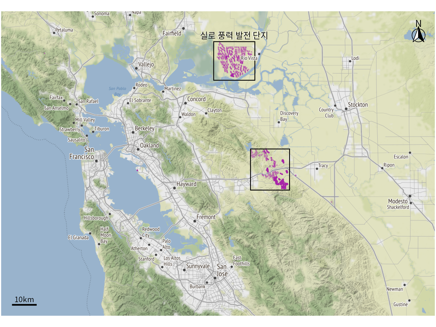 (ref:sfbay-overview) 샌프란시스코만 지역의 풍력 터빈. 개별 풍력 터빈은 보라색 점으로 표시됩니다. 풍력 터빈이 밀집된 두 지역은 검은색 사각형으로 강조 표시됩니다. 리오 비스타 근처의 풍력 터빈을 통칭하여 실로 풍력 발전 단지라고 합니다. 지도 타일: Stamen Design, CC BY 3.0. 지도 데이터: OpenStreetMap, ODbL. 풍력 터빈 데이터: 미국 풍력 터빈 데이터베이스