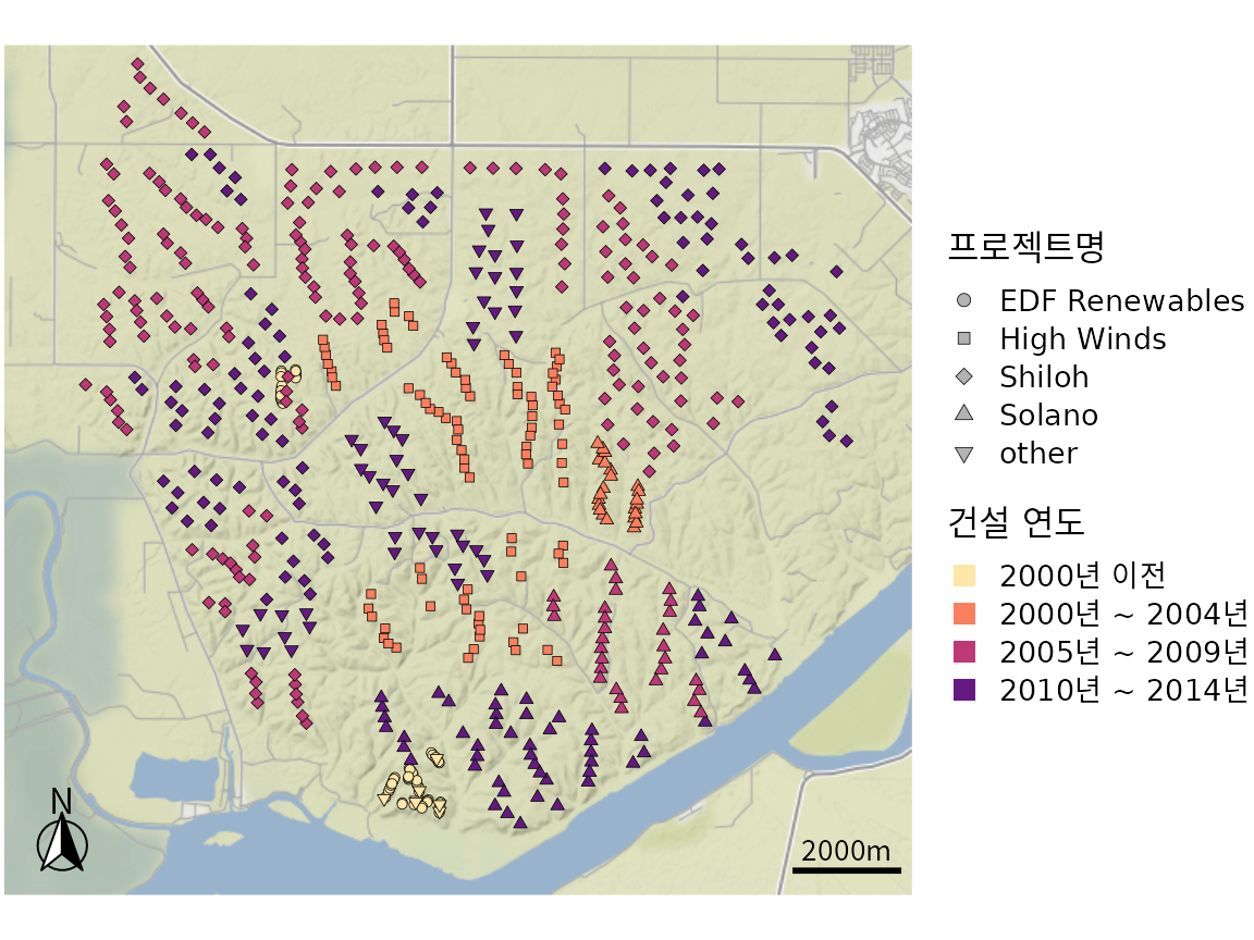 챕터 ?sec-aesthetic-mapping에서 논의된 모든 개념, 즉 데이터를 미학적 요소에 매핑하는 개념은 지도에도 적용됩니다. 데이터 포인트를 지리적 맥락에 배치하고 색상이나 모양과 같은 미학적 요소를 통해 다른 데이터 차원을 표시할 수 있습니다. 예를 들어 그림 ?fig-shiloh-map은 그림 ?fig-sfbay-overview에서 “실로 풍력 발전 단지”로 표시된 사각형의 확대된 보기를 제공합니다. 개별 풍력 터빈은 점으로 표시되며 점의 색상은 특정 터빈이 건설된 시기를 나타내고 모양은 풍력 터빈이 속한 프로젝트를 나타냅니다. 이와 같은 지도는 지역이 어떻게 개발되었는지에 대한 간략한 개요를 제공할 수 있습니다. 예를 들어 여기서는 EDF Renewables가 2000년 이전에 건설된 비교적 작은 프로젝트이고 High Winds는 2000년에서 2004년 사이에 건설된 중간 규모의 프로젝트이며 Shiloh와 Solano는 이 지역에서 가장 큰 두 프로젝트로 모두 장기간에 걸쳐 건설되었음을 알 수 있습니다.