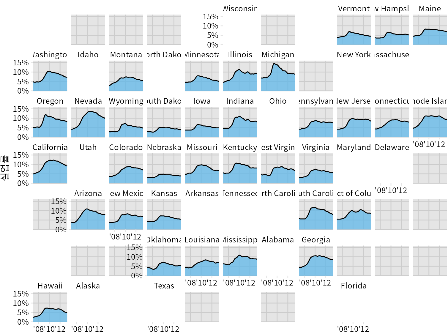마지막으로 각 주의 위치에 개별 플롯을 배치하여 더 복잡한 카토그램을 그릴 수 있습니다. 예를 들어 각 주의 시간 경과에 따른 실업률 변화를 시각화하려는 경우 각 주에 대해 개별 그래프를 그린 다음 주들의 대략적인 상대적 위치에 따라 그래프를 배열하는 것이 도움이 될 수 있습니다(그림 Figure 17.15). 미국 지리에 익숙한 사람에게는 이 배열이 예를 들어 알파벳순으로 배열하는 것보다 특정 주의 그래프를 더 쉽게 찾을 수 있도록 할 수 있습니다. 또한 이웃한 주는 유사한 패턴을 보일 것으로 예상되며 그림 ?fig-unemployment-geofacet은 실제로 그렇다는 것을 보여줍니다.