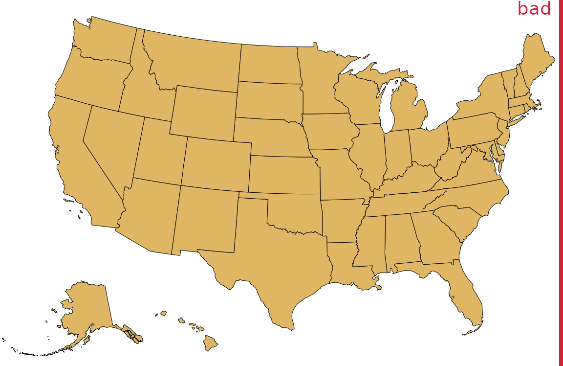 흥미롭지 않은 빈 공간 문제를 해결하기 위해 알래스카와 하와이를 별도로 투영하여(모양 왜곡을 최소화하기 위해) 하위 48개 주 아래에 표시하는 것이 일반적인 관행입니다(그림 Figure 17.4). 그림 ?fig-usa-albers에서 알래스카가 그림 ?fig-usa-true-albers에서보다 하위 48개 주에 비해 훨씬 작게 보이는 것을 알 수 있습니다. 이러한 불일치의 이유는 알래스카가 이동했을 뿐만 아니라 일반적인 중서부 또는 서부 주와 비슷한 크기로 보이도록 축척되었기 때문입니다. 이러한 축척은 일반적인 관행이지만 매우 오해의 소지가 있으므로 그림에 “나쁨”이라고 표시했습니다.