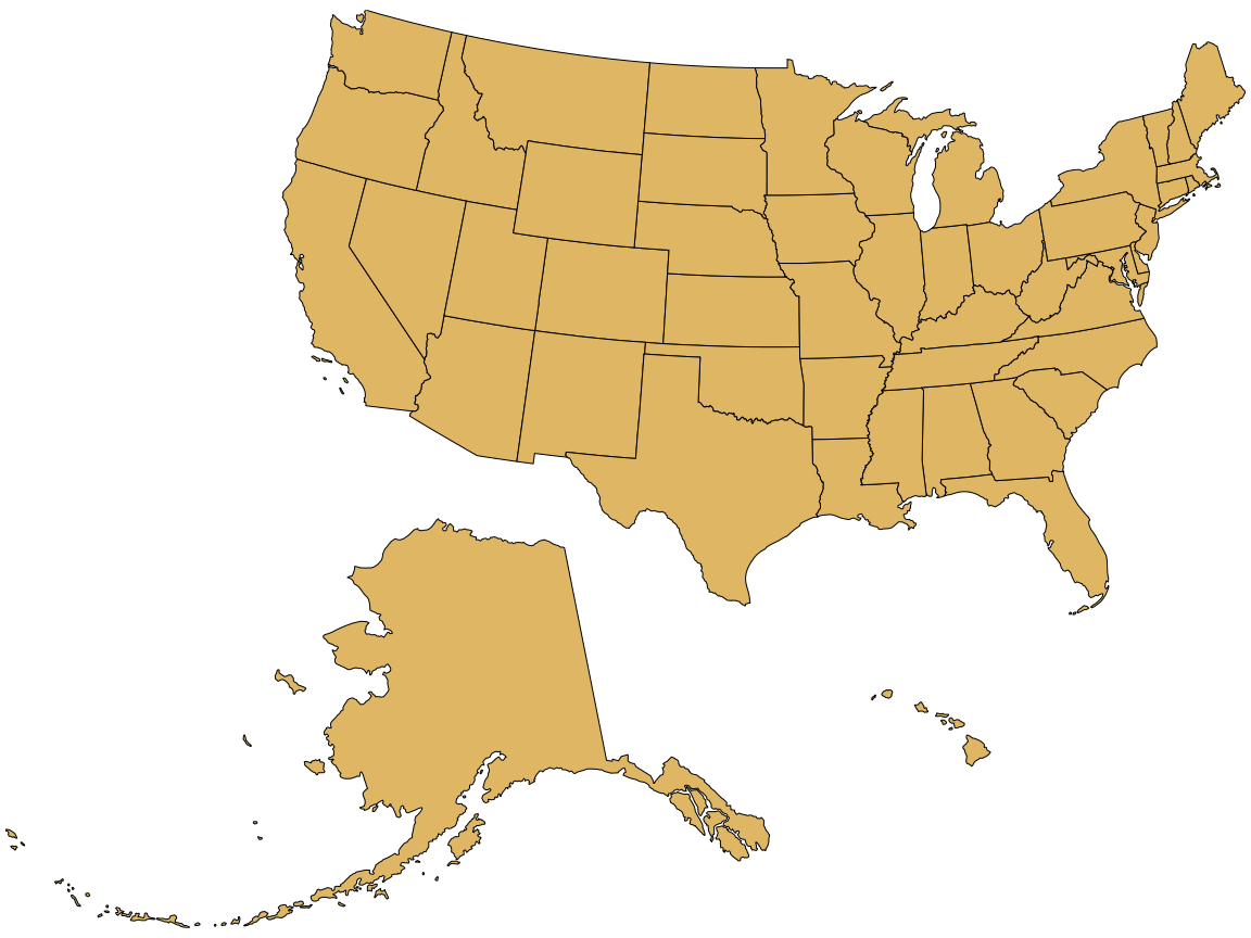 지도 투영으로 인한 모양 또는 면적 왜곡은 전 세계 지도를 만들려고 할 때 특히 두드러지지만 개별 대륙이나 국가 규모에서도 문제를 일으킬 수 있습니다. 예를 들어 “하위 48개 주”(연속된 48개 주), 알래스카, 하와이로 구성된 미국을 생각해 보십시오(그림 Figure 17.2). 하위 48개 주만 지도에 투영하는 것은 비교적 쉽지만 알래스카와 하와이는 하위 48개 주에서 너무 멀리 떨어져 있어 50개 주 전체를 하나의 지도에 투영하는 것이 어색해집니다.