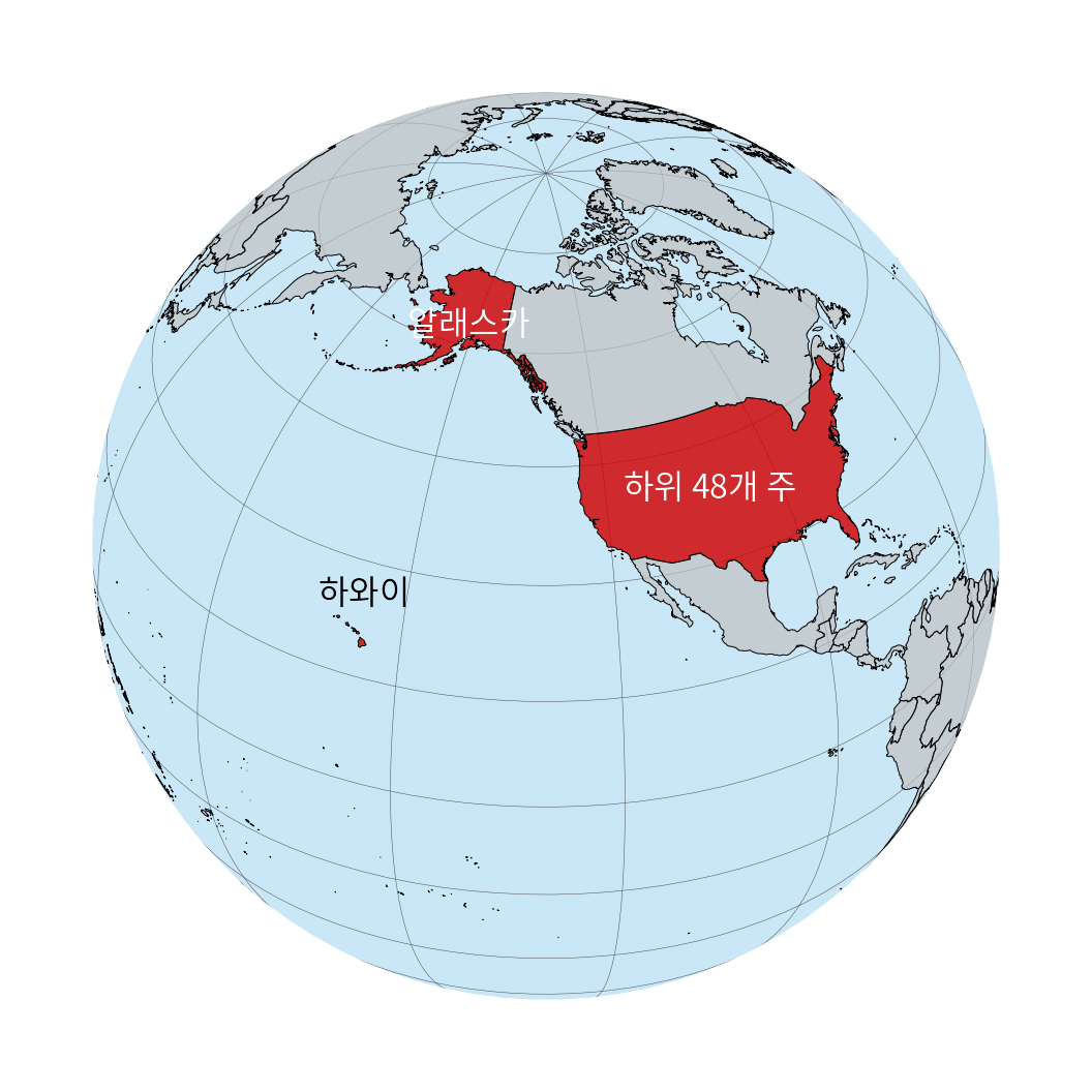 (ref:usa-orthographic) 지구본 위에서 본 알래스카, 하와이, 그리고 나머지 48개 주의 실제 위치 관계.
