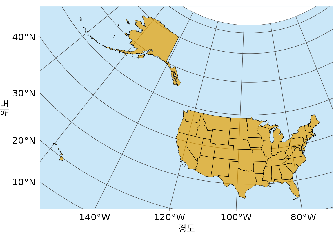 그림 ?fig-usa-true-albers는 등면적 알버스 투영법을 사용하여 만든 50개 주 전체 지도를 보여줍니다. 이 투영법은 50개 주의 상대적인 모양, 면적, 위치를 합리적으로 표현하지만 몇 가지 문제가 있습니다. 첫째, 알래스카는 예를 들어 그림 ?fig-world-mercator 또는 ?fig-usa-orthographic에서 보이는 모습에 비해 이상하게 늘어나 보입니다. 둘째, 지도는 바다/빈 공간이 지배적입니다. 하위 48개 주가 지도 면적의 더 큰 부분을 차지하도록 더 확대할 수 있다면 더 좋을 것입니다.