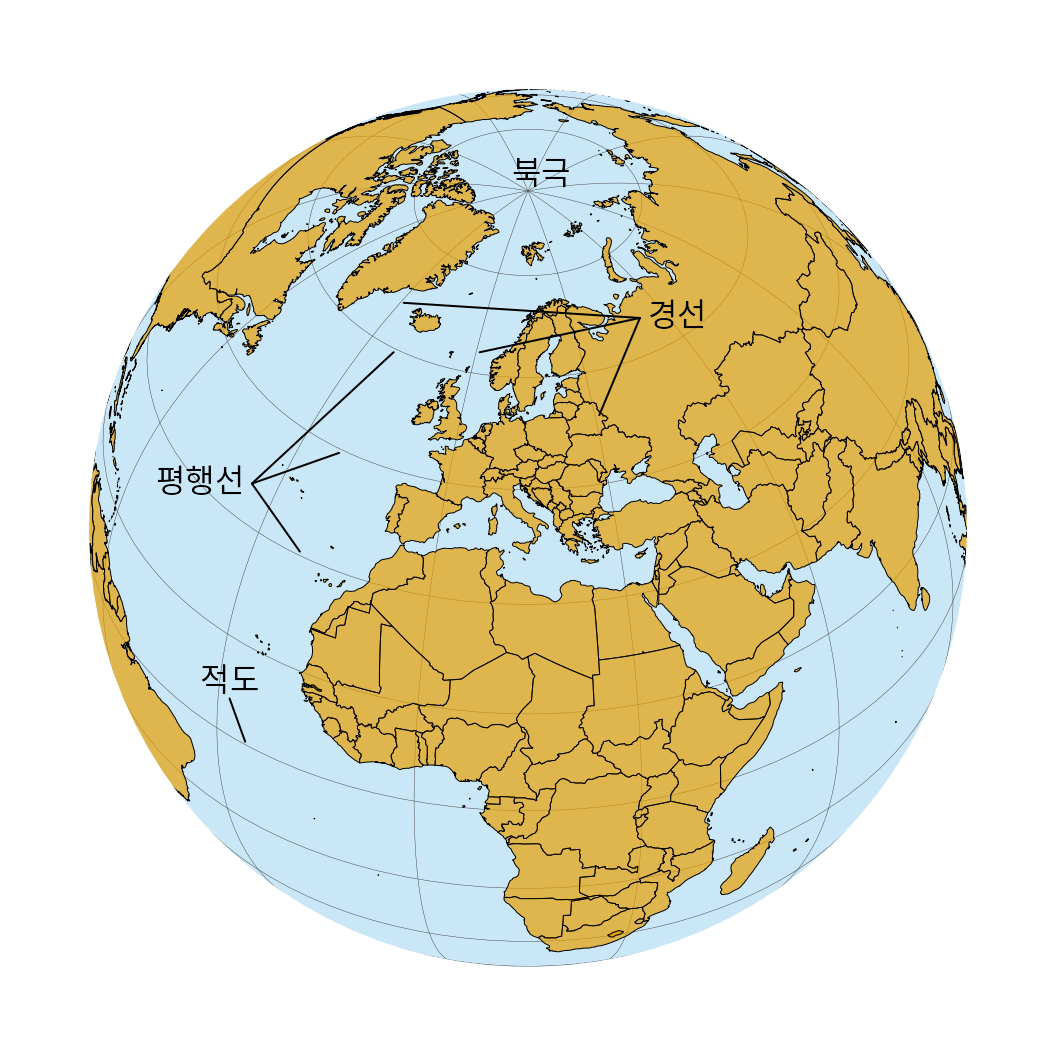 (ref:world-orthographic) 우주에서 바라본 지구(정사 투영). 북극에서 수직으로 뻗은 선을 경선(meridians), 그와 교차하는 가로선을 평행선(parallels)이라고 합니다.