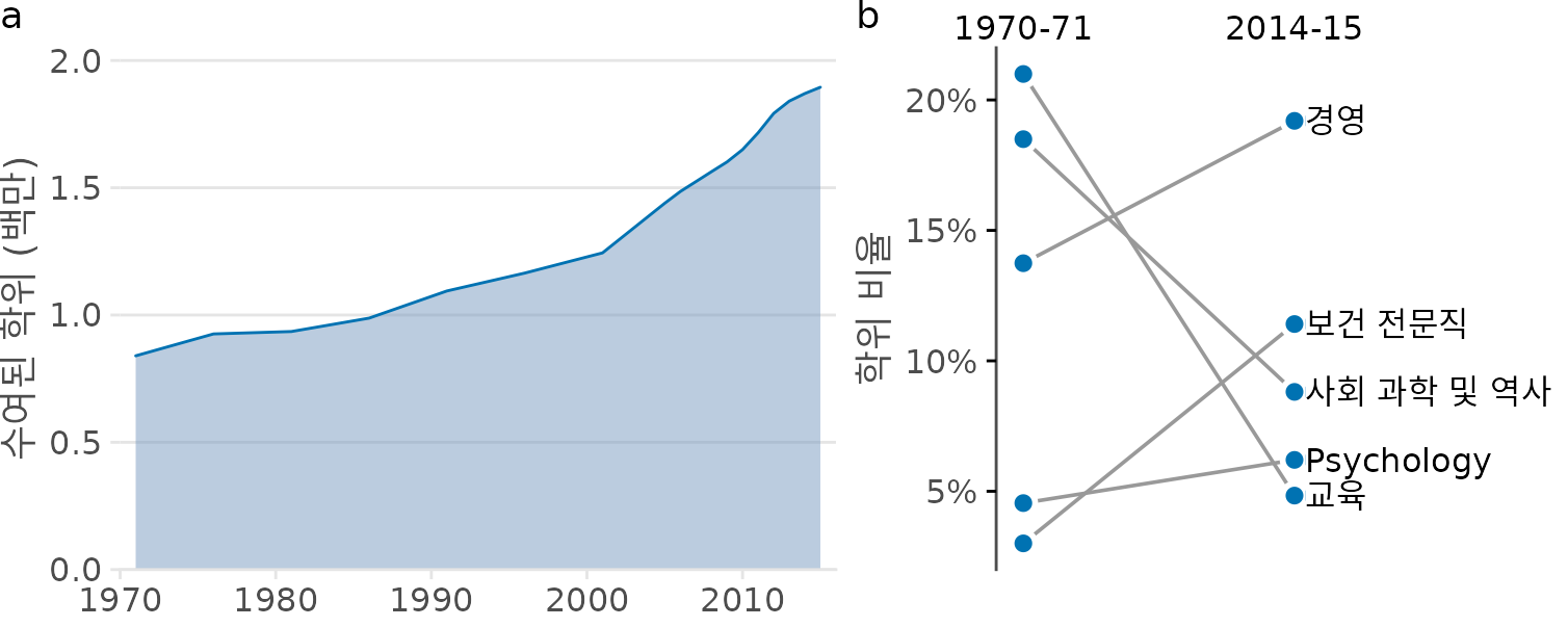 (ref:BA-degrees-compound) 미국 고등 교육 기관에서 수여한 학사 학위 동향. (a) 1970년부터 2015년까지 총 학위 수는 거의 두 배가 되었습니다. (b) 가장 인기 있는 학위 분야 중 사회 과학, 역사, 교육은 크게 감소한 반면 경영 및 보건 전문직은 성장했습니다. 데이터 출처: 국립 교육 통계 센터
