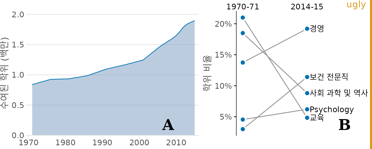 작은 다중 그림 예제와 달리 복합 그림의 개별 패널에는 알파벳 레이블이 지정되어 있습니다. 라틴 알파벳의 소문자 또는 대문자를 사용하는 것이 일반적입니다. 특정 패널을 고유하게 지정하려면 레이블링이 필요합니다. 예를 들어 그림 ?fig-BA-degrees-compound에서 학위 수여 비율의 변화를 보여주는 부분에 대해 이야기하고 싶다면 해당 그림의 (b) 패널 또는 간단히 그림 Figure 23.4 (b)를 참조할 수 있습니다. 레이블링이 없으면 그림 ?fig-BA-degrees-compound의 “오른쪽 패널” 또는 “왼쪽 패널”에 대해 어색하게 이야기해야 하며 더 복잡한 패널 배열의 경우 특정 패널을 참조하는 것이 훨씬 더 어색할 것입니다. 작은 다중 그림의 경우 각 패널이 그림 레이블로 제공되는 패싯 변수에 의해 고유하게 지정되므로 레이블링이 필요하지 않으며 일반적으로 수행되지 않습니다.