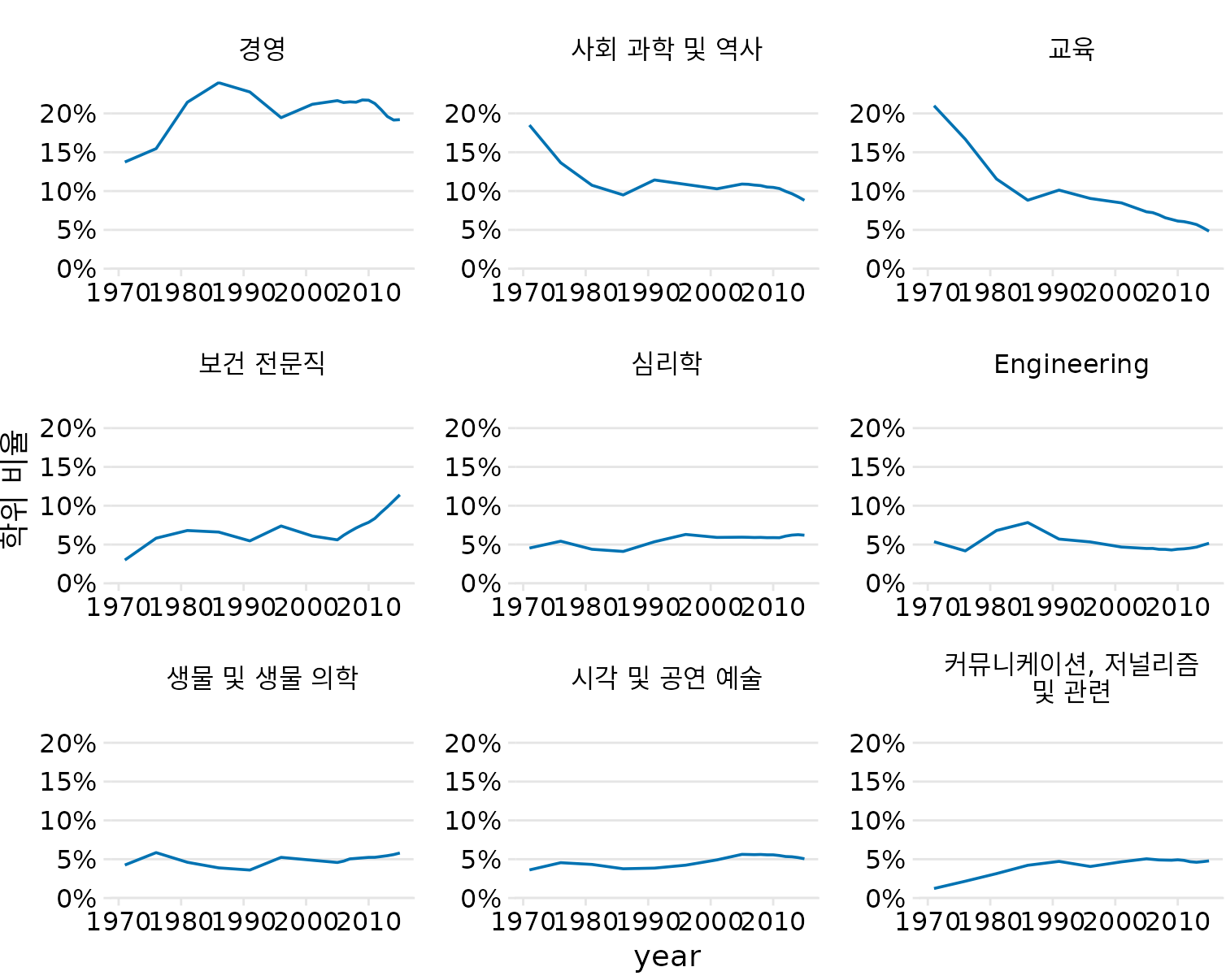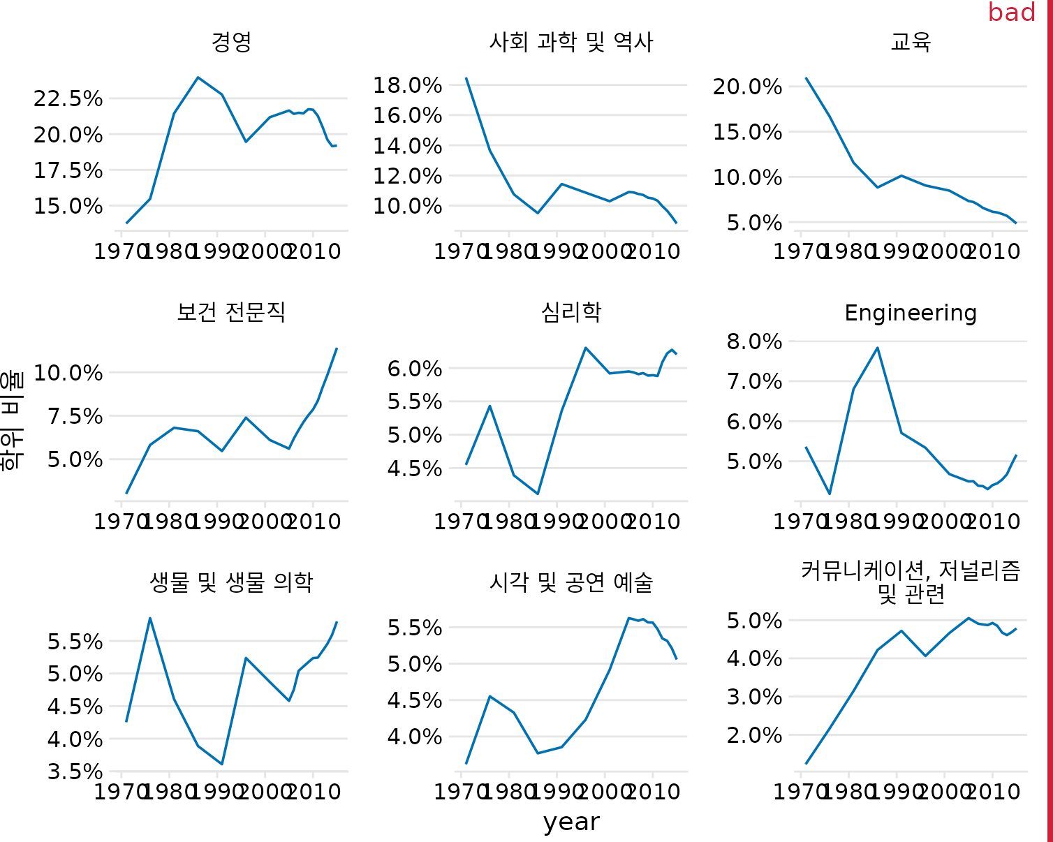 이러한 큰 그림을 쉽게 이해하려면 각 패널이 동일한 축 범위와 배율을 사용하는 것이 중요합니다. 인간의 마음은 이것이 사실이라고 예상합니다. 그렇지 않으면 독자가 그림이 보여주는 것을 잘못 해석할 가능성이 높습니다. 예를 들어 그림 ?fig-BA-degrees-variable-y-lims를 생각해 보십시오. 이 그림은 여러 학위 분야에서 학사 학위 비율이 시간 경과에 따라 어떻게 변했는지 보여줍니다. 이 그림은 1971년부터 2015년까지 평균적으로 모든 학위의 4% 이상을 차지한 9개 학위 분야를 보여줍니다. 각 학위 분야의 곡선이 전체 y 축 범위를 차지하도록 패널의 y 축 배율이 조정되었습니다. 결과적으로 그림 ?fig-BA-degrees-variable-y-lims을 대충 살펴보면 9개 학위 분야가 모두 똑같이 인기가 있고 모두 비슷한 규모의 인기 변화를 경험했음을 알 수 있습니다.