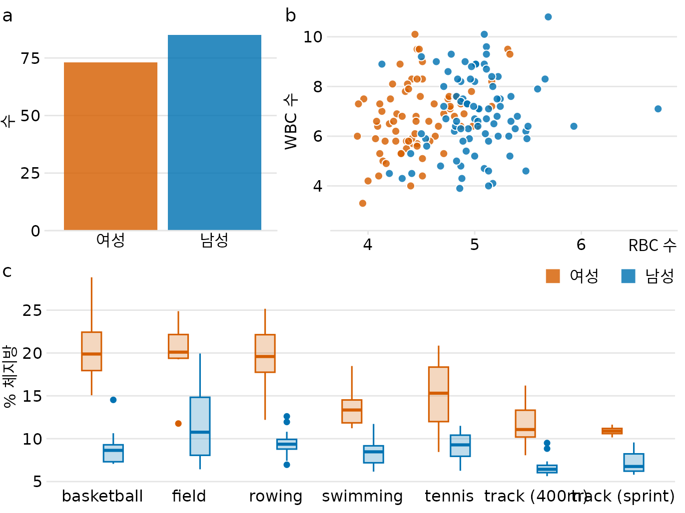 그림 ?fig-athletes-composite-good은 이러한 모든 문제를 해결합니다. 이 그림에서 여성 운동선수는 일관되게 주황색으로 표시되고 남성 운동선수의 왼쪽에 표시되며 남성 운동선수는 파란색으로 표시됩니다. 이 그림이 그림 ?fig-athletes-composite-inconsistent보다 얼마나 읽기 쉬운지 주목하십시오. 일관된 시각적 언어를 사용하면 여러 패널의 어떤 시각적 요소가 여성을 나타내고 어떤 요소가 남성을 나타내는지 결정하는 데 많은 정신적 노력이 필요하지 않습니다. 반면에 그림 ?fig-athletes-composite-inconsistent은 상당히 혼란스러울 수 있습니다. 특히 언뜻 보면 남성이 여성보다 체지방률이 높은 경향이 있다는 인상을 줄 수 있습니다. 또한 그림 ?fig-athletes-composite-good에는 범례가 하나만 필요하지만 그림 ?fig-athletes-composite-inconsistent에는 두 개가 필요했습니다. 시각적 언어가 일관되므로 (b) 및 (c) 패널에 동일한 범례가 작동합니다.