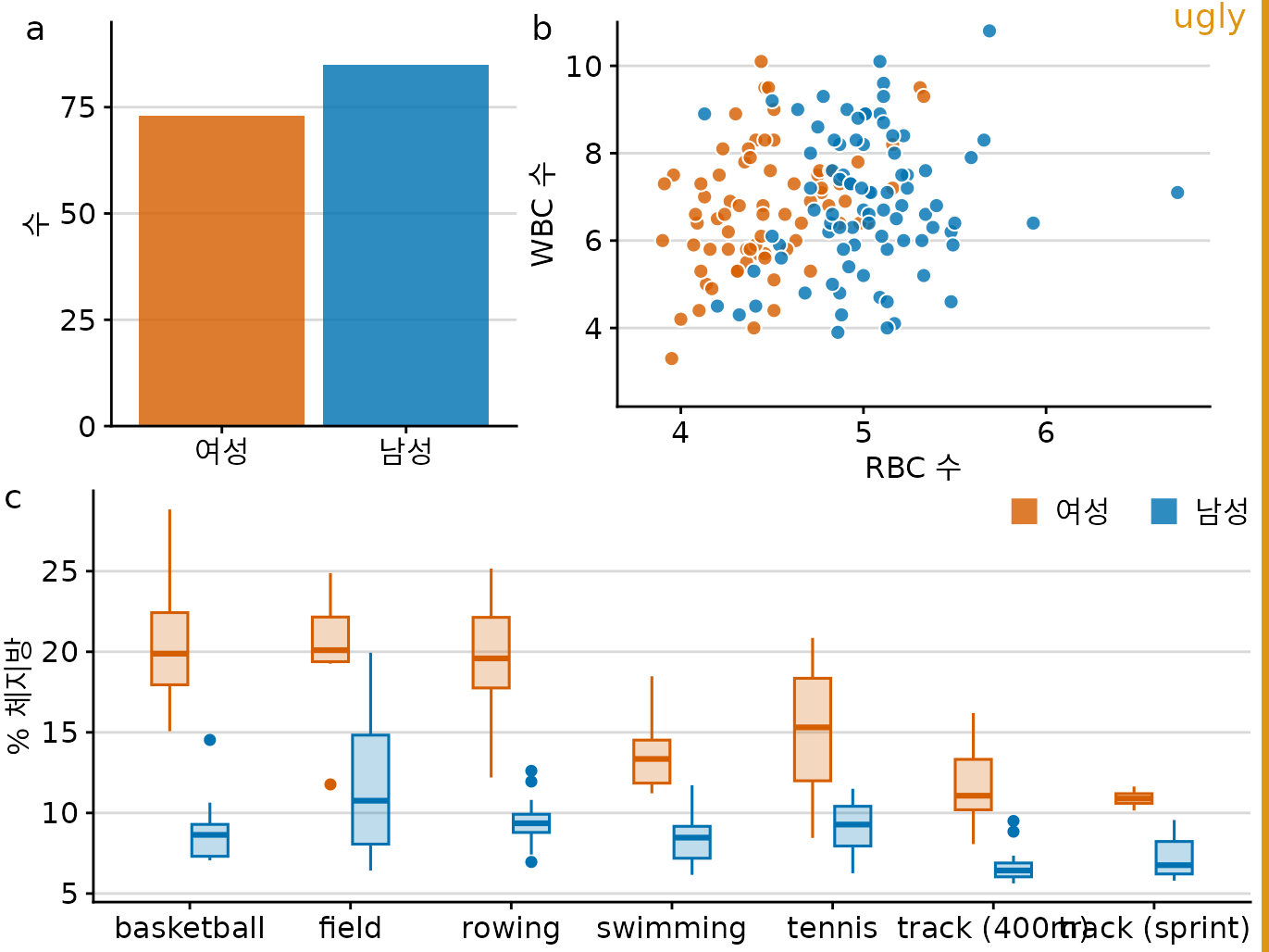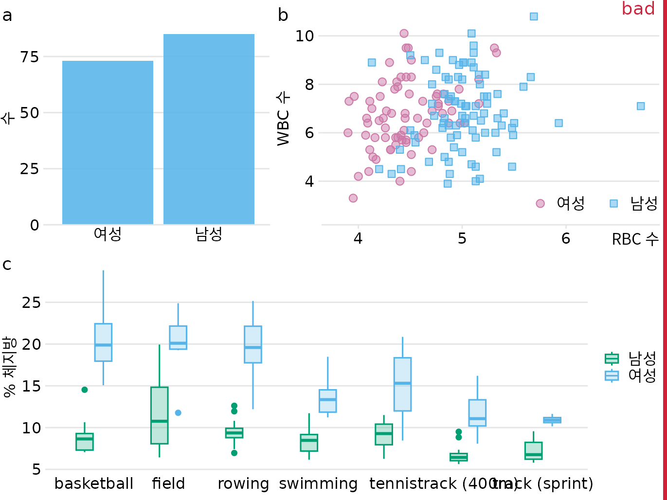 이 원칙을 위반하는 예를 살펴보겠습니다. 그림 ?fig-athletes-composite-inconsistent은 남성과 여성 운동선수의 생리학 및 신체 구성에 대한 데이터 세트를 시각화하는 3패널 그림입니다. (a) 패널은 데이터 세트의 남성과 여성 수를 보여주고, (b) 패널은 남성과 여성의 적혈구 및 백혈구 수를 보여주며, (c) 패널은 스포츠별로 분류된 남성과 여성의 체지방률을 보여줍니다. 각 패널은 개별적으로 수용 가능한 그림입니다. 그러나 조합하면 공통된 시각적 언어를 공유하지 않기 때문에 세 패널이 작동하지 않습니다. 첫째, (a) 패널은 남성과 여성 운동선수 모두에게 동일한 파란색을 사용하고, (b) 패널은 남성 운동선수에게만 사용하며, (c) 패널은 여성 운동선수에게 사용합니다. 또한 (b) 및 (c) 패널에는 추가 색상이 도입되지만 이러한 색상은 두 패널 간에 다릅니다. 남성과 여성 운동선수에게 동일한 두 가지 색상을 일관되게 사용하고 (a) 패널에도 동일한 색상 구성표를 적용하는 것이 더 좋았을 것입니다. 둘째, (a) 및 (b) 패널에서는 여성이 왼쪽에 있고 남성이 오른쪽에 있지만 (c) 패널에서는 순서가 반대입니다. (c) 패널의 상자 그림 순서는 (a) 및 (b) 패널과 일치하도록 변경해야 합니다.