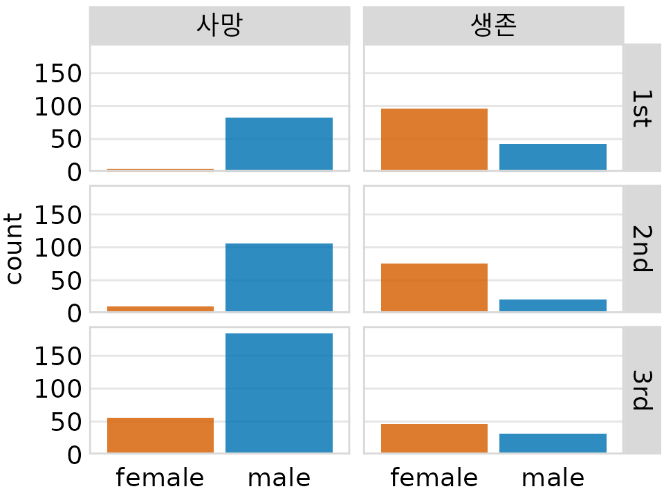 첫 번째 예로 타이타닉 승객 데이터 세트에 이 기법을 적용합니다. 이 데이터 세트를 각 승객이 여행한 등급과 승객이 생존했는지 여부에 따라 하위 그룹으로 나눌 수 있습니다. 이러한 6개의 데이터 조각 각각에는 남성 및 여성 승객이 모두 있으며 막대를 사용하여 그 수를 시각화할 수 있습니다. 결과는 6개의 막대 그래프이며, 3개 행(각 등급에 대해 하나씩)의 두 열(사망한 승객에 대해 하나, 생존한 승객에 대해 하나)로 배열합니다(그림 Figure 23.1). 열과 행에는 레이블이 지정되어 있으므로 6개의 플롯 중 어떤 것이 생존 상태와 등급의 어떤 조합에 해당하는지 즉시 명확합니다.