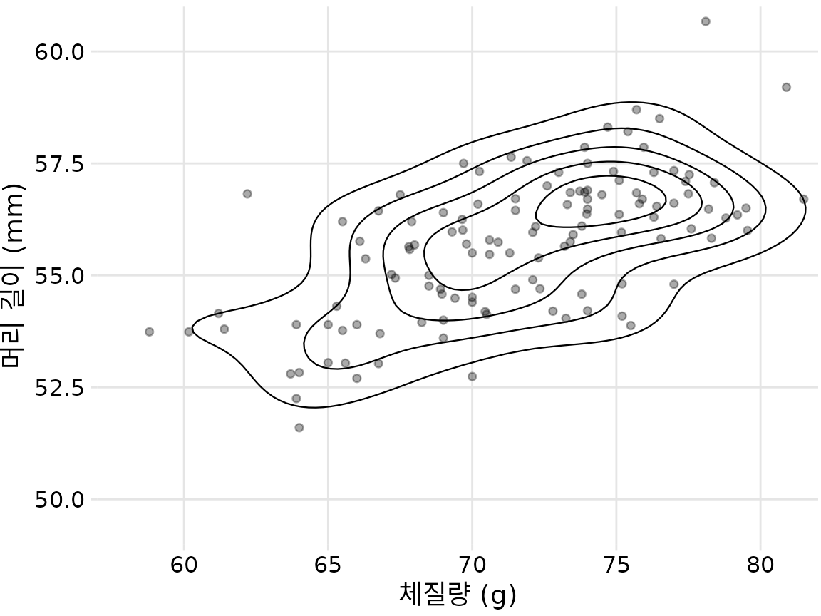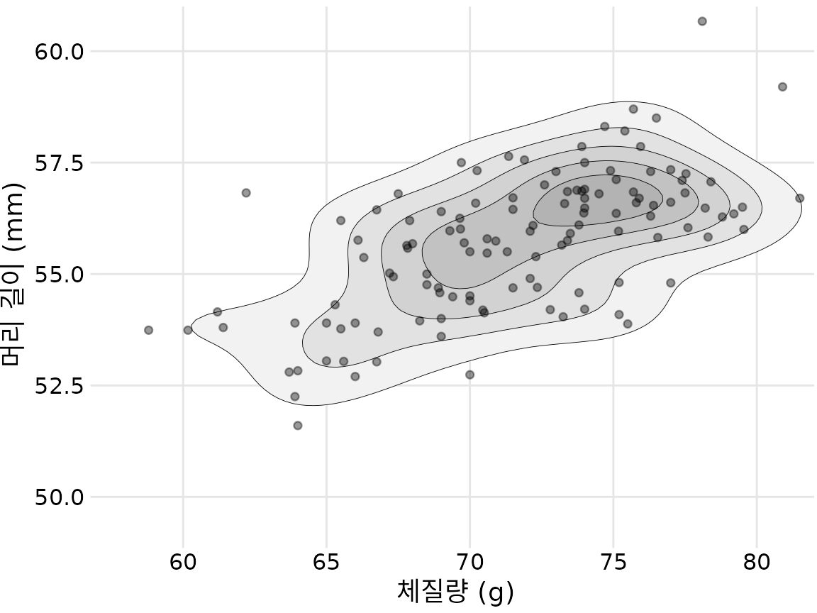 이 접근 방식의 예로 챕터 ?sec-visualizing-associations의 파랑어치 데이터 세트로 돌아가 보겠습니다. 그림 ?fig-blue-jays-scatter은 123마리 파랑어치의 머리 길이와 체질량 간의 관계를 보여주었으며 점들 사이에 약간의 중복이 있었습니다. 점을 더 작고 부분적으로 투명하게 만들고 유사한 점 밀도 영역을 나타내는 등고선 위에 플로팅하여 점 분포를 더 명확하게 강조 표시할 수 있습니다(그림 Figure 20.8). 등고선으로 둘러싸인 영역을 음영 처리하고 더 높은 점 밀도를 나타내는 영역에 더 어두운 색상을 사용하여 점 밀도 변화에 대한 인식을 더욱 향상시킬 수 있습니다(그림 Figure 20.9).