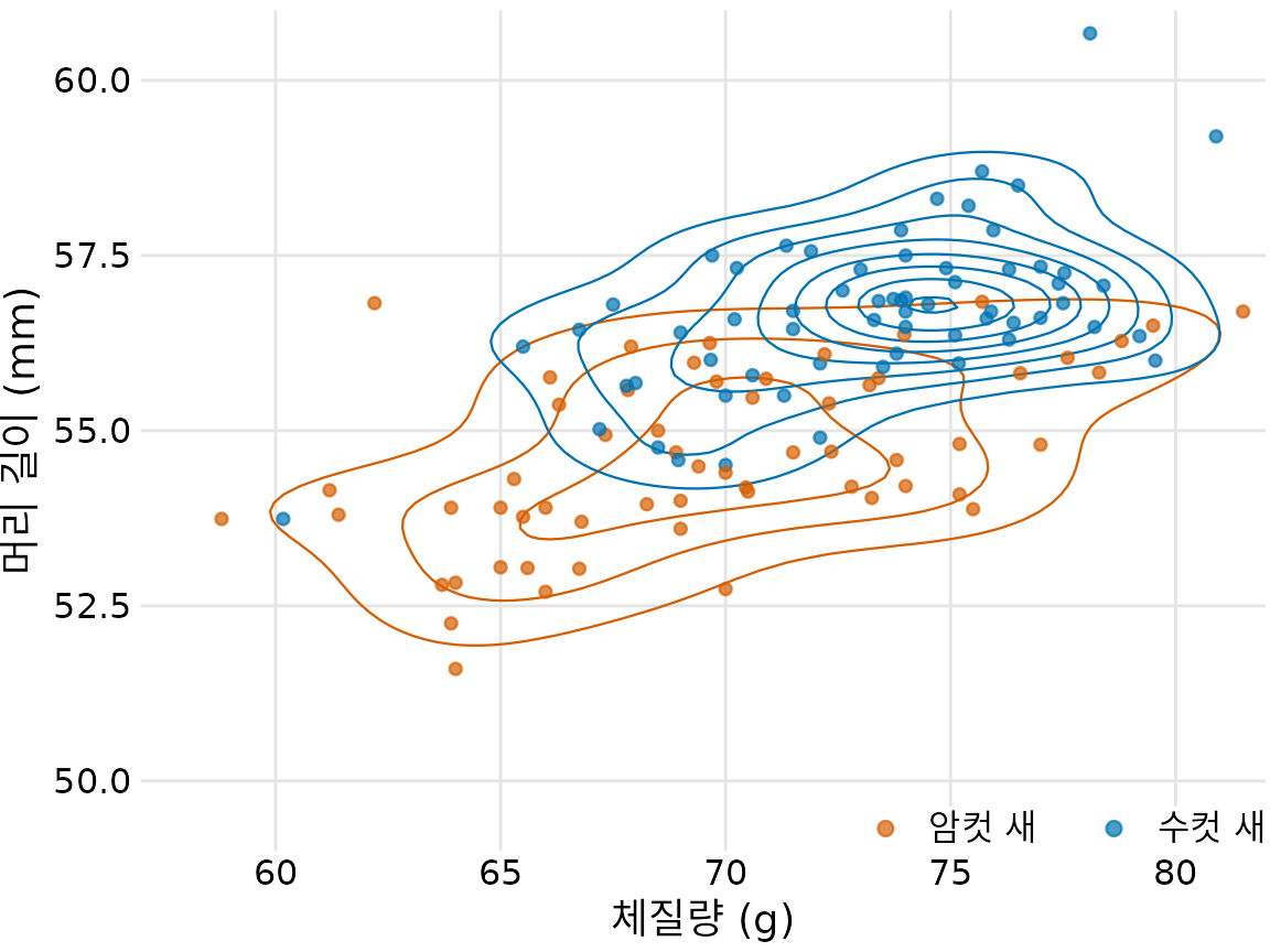 챕터 ?sec-visualizing-associations에서는 수컷과 암컷 새에 대해 머리 길이와 체질량 간의 관계도 살펴보았습니다(그림 Figure 14.2). 수컷과 암컷 새에 대해 별도로 색칠된 등고선을 그려 등고선으로도 동일한 작업을 수행할 수 있습니다(그림 Figure 20.10).