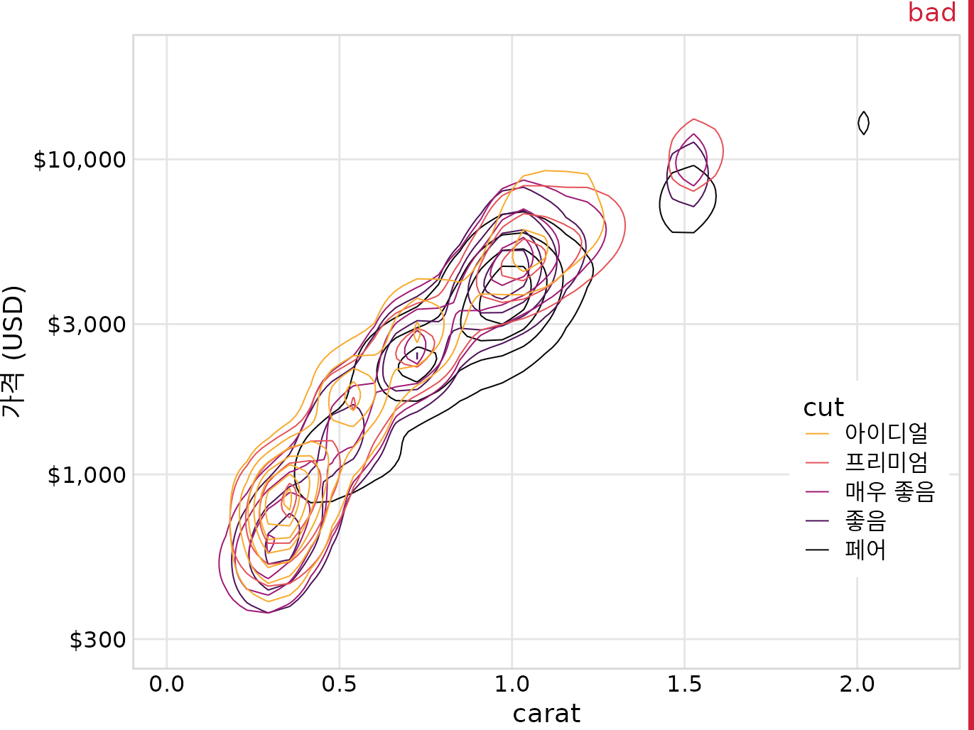 (ref:diamonds-contour-colors) 다이아몬드의 캐럿 값 대비 가격. 그림 ?fig-diamonds-points와 같지만 이제 개별 점이 등고선으로 대체되었습니다. 결과 플롯은 등고선이 모두 서로 겹쳐 있기 때문에 여전히 “나쁨”으로 표시됩니다. 개별 컷에 대한 점 분포나 전체 점 분포를 식별할 수 없습니다. 데이터 출처: 해들리 위컴, ggplot2