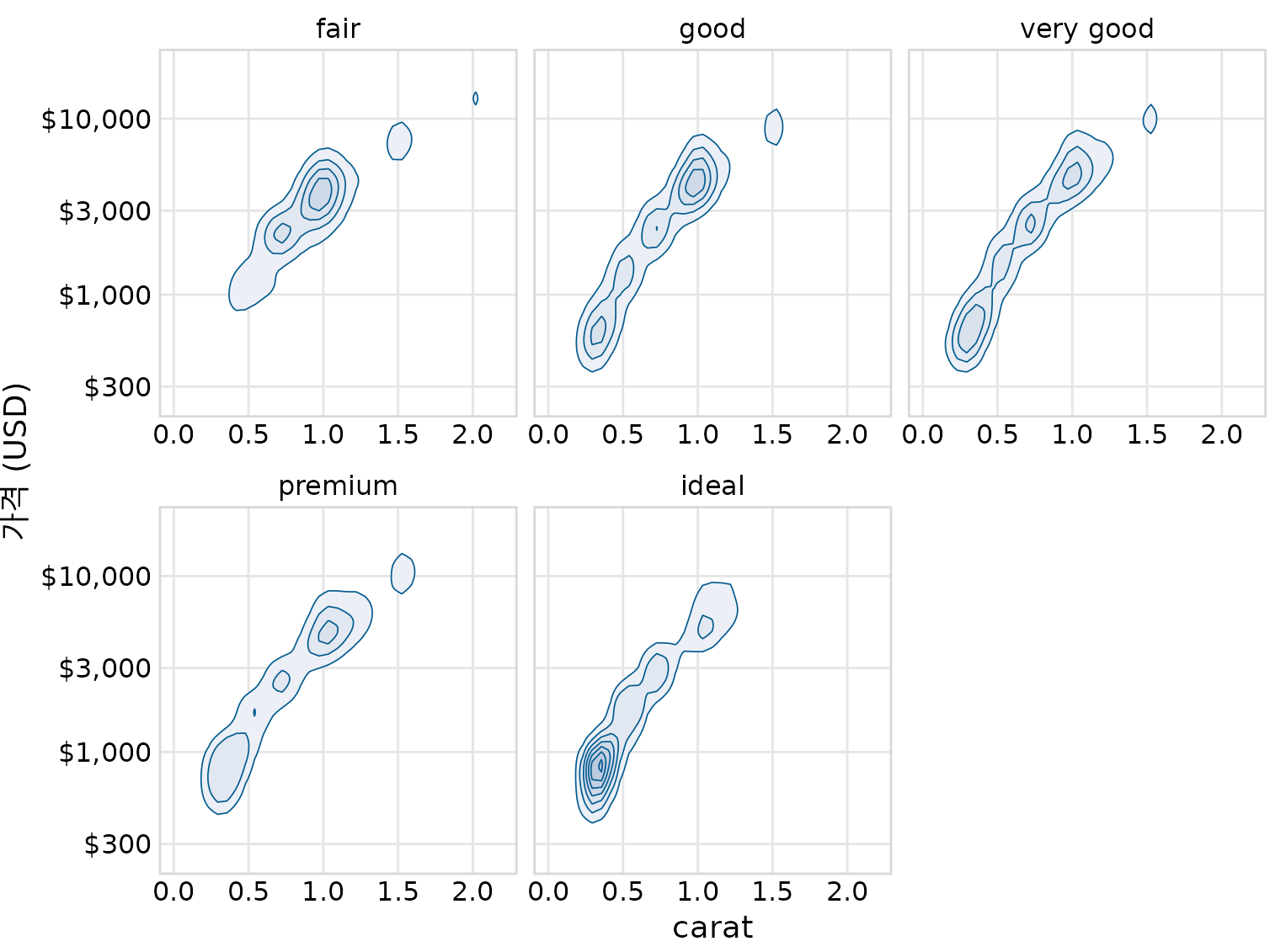 여기서 도움이 되는 것은 각 컷 품질에 대한 등고선을 자체 플롯 패널에 그리는 것입니다(그림 Figure 20.13). 모든 것을 하나의 패널에 그리는 목적은 그룹 간의 시각적 비교를 가능하게 하는 것일 수 있지만 그림 ?fig-diamonds-contour-colors는 너무 복잡하여 비교가 불가능합니다. 대신 그림 ?fig-diamonds-contour-facets에서는 배경 격자를 통해 등고선이 격자선에 대해 정확히 어디에 있는지 주의하여 컷 품질 간의 비교를 할 수 있습니다. (각 패널에 등고선 대신 부분적으로 투명한 개별 점을 플로팅하여 유사한 효과를 얻을 수 있었을 것입니다.)