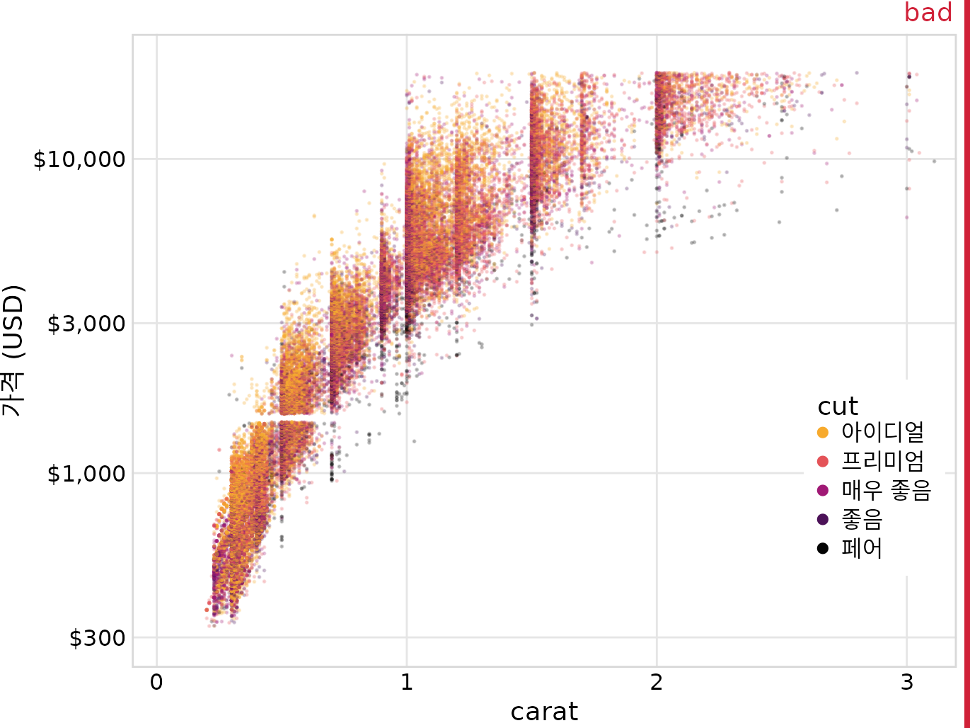 (ref:diamonds-points) 53,940개 개별 다이아몬드의 캐럿 값 대비 가격. 각 다이아몬드의 컷은 색상으로 표시됩니다. 광범위한 중복 플로팅으로 인해 여러 다이아몬드 컷 간의 패턴을 식별할 수 없으므로 플롯은 “나쁨”으로 표시됩니다. 데이터 출처: 해들리 위컴, ggplot2