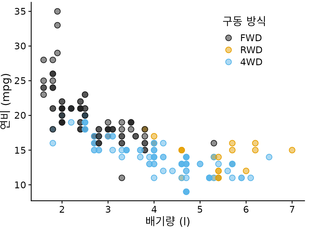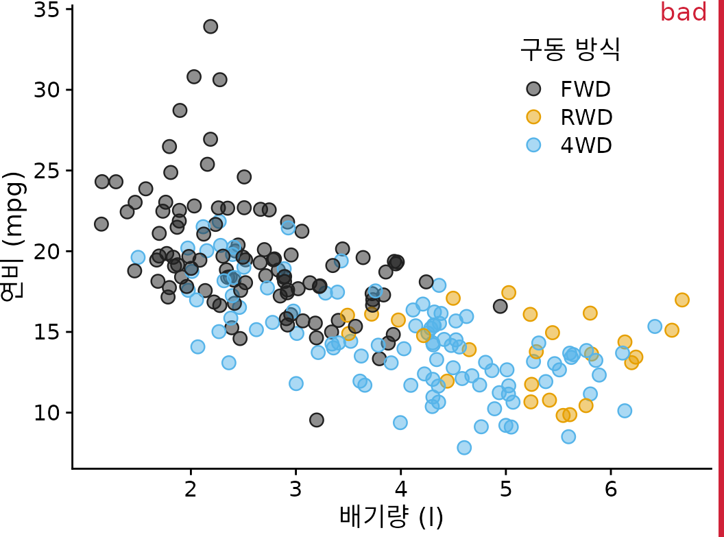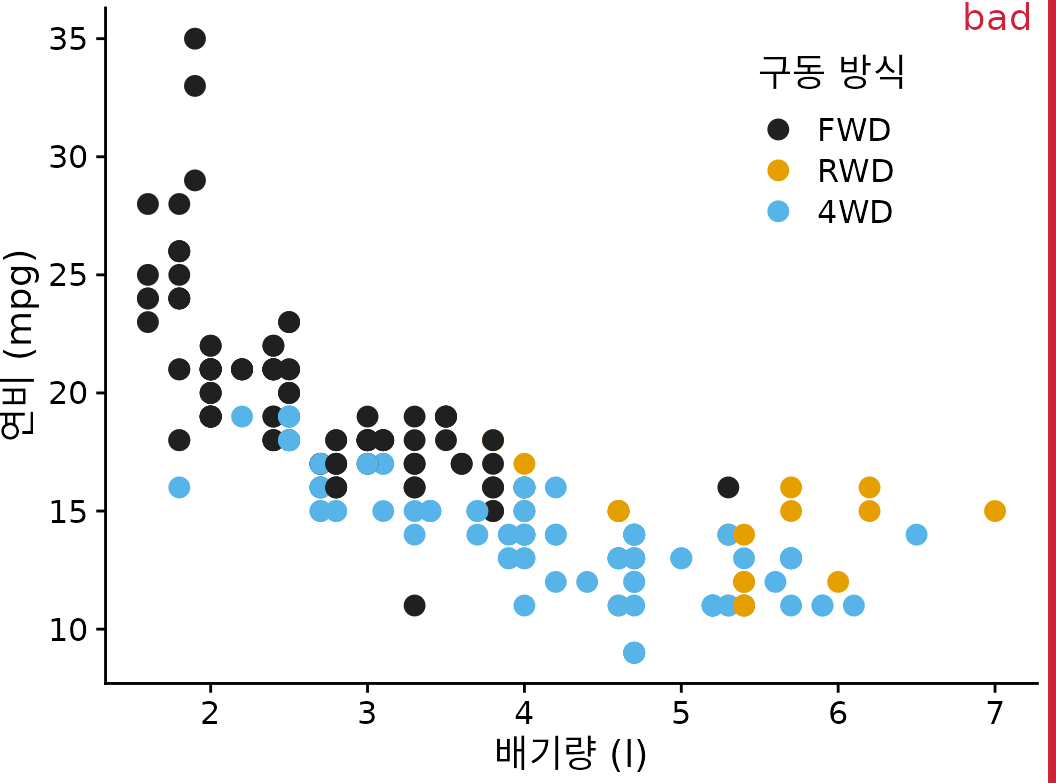 (ref:mpg-cty-displ-solid) 1999년에서 2008년 사이에 출시된 인기 자동차의 도시 연비 대 엔진 배기량. 각 점은 하나의 자동차를 나타냅니다. 점 색상은 구동 방식(전륜 구동(FWD), 후륜 구동(RWD) 또는 4륜 구동(4WD))을 나타냅니다. 많은 점이 다른 점 위에 그려져 가려지기 때문에 그림은 “나쁨”으로 표시되었습니다.