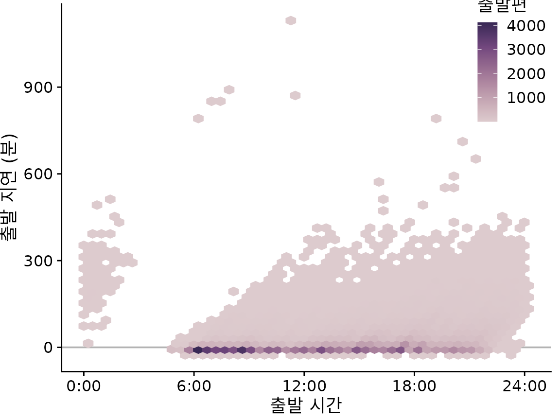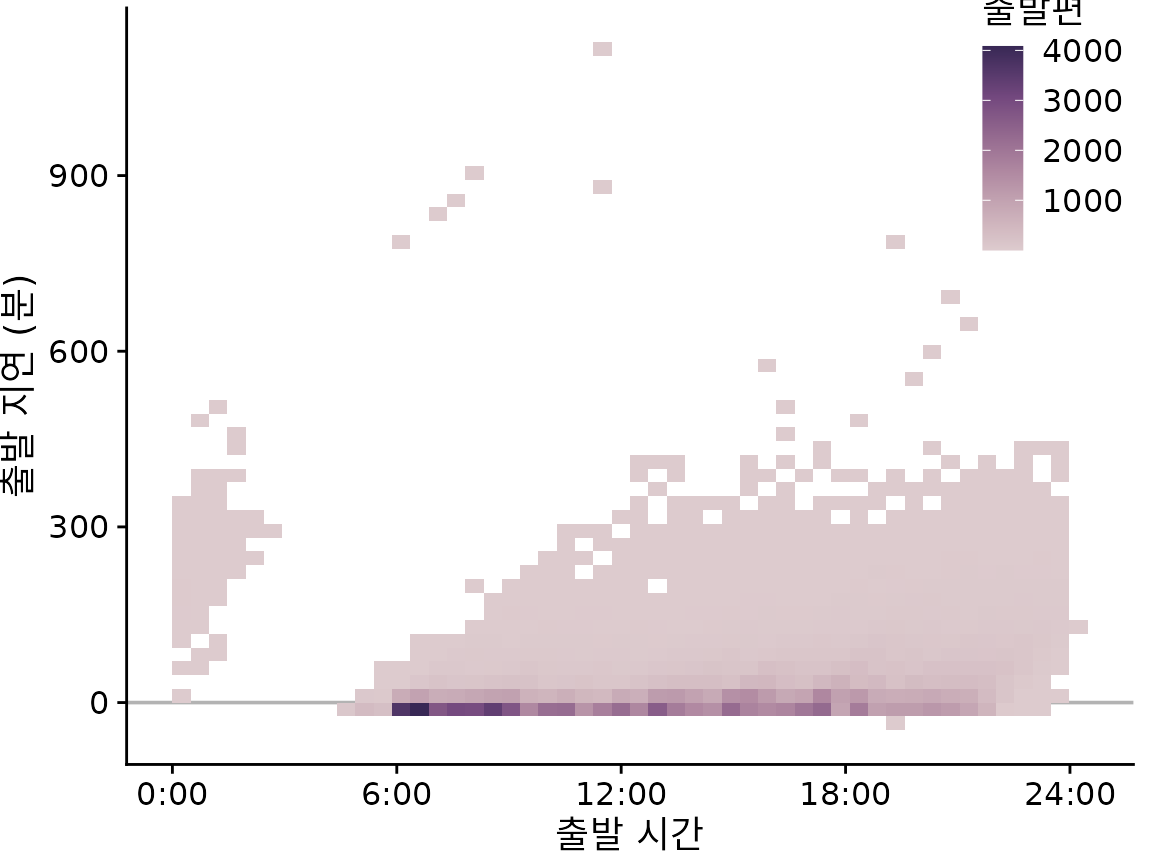 이러한 경우 개별 점을 플로팅하는 대신 2D 히스토그램을 만들 수 있습니다. 2D 히스토그램은 개념적으로 챕터 ?sec-histograms-density-plots에서 논의된 1D 히스토그램과 유사하지만 이제 데이터를 2차원으로 구간화합니다. 전체 x–y 평면을 작은 사각형으로 세분화하고 각 사각형에 몇 개의 관찰값이 들어가는지 계산한 다음 해당 개수로 사각형을 색칠합니다. 그림 ?fig-nycflights-2d-bins는 출발 지연 데이터에 대한 이 접근 방식의 결과를 보여줍니다. 이 시각화는 항공편 출발 데이터의 몇 가지 중요한 특징을 명확하게 강조합니다. 첫째, 낮 시간(오전 6시부터 오후 9시경까지)의 대부분의 출발은 실제로 지연 없이 또는 심지어 일찍(음의 지연) 출발합니다. 그러나 적당한 수의 출발에는 상당한 지연이 있습니다. 또한 하루 중 비행기가 늦게 출발할수록 지연이 더 커질 수 있습니다. 중요하게도 출발 시간은 예정된 출발 시간이 아니라 실제 출발 시간입니다. 따라서 이 그림은 일찍 출발하도록 예정된 비행기가 절대 지연되지 않는다는 것을 반드시 알려주지는 않습니다. 그러나 비행기가 일찍 출발하면 지연이 거의 없거나 매우 드문 경우 약 900분 지연된다는 것을 알려줍니다.