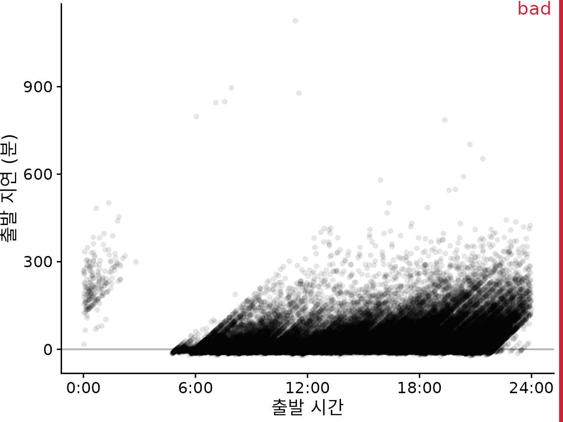 그림 ?fig-nycflights-points는 100,000건 이상의 개별 항공편에 대한 출발 지연을 보여주며 각 점은 하나의 항공편 출발을 나타냅니다. 개별 점을 상당히 투명하게 만들었음에도 불구하고 대부분은 0분에서 300분 사이의 출발 지연 사이에 검은색 띠를 형성합니다. 이 띠는 대부분의 항공편이 거의 정시에 출발하는지 아니면 상당한 지연(예: 50분 이상)으로 출발하는지를 모호하게 만듭니다. 동시에 가장 지연된 항공편(400분 이상 지연)은 점의 투명도 때문에 거의 보이지 않습니다.