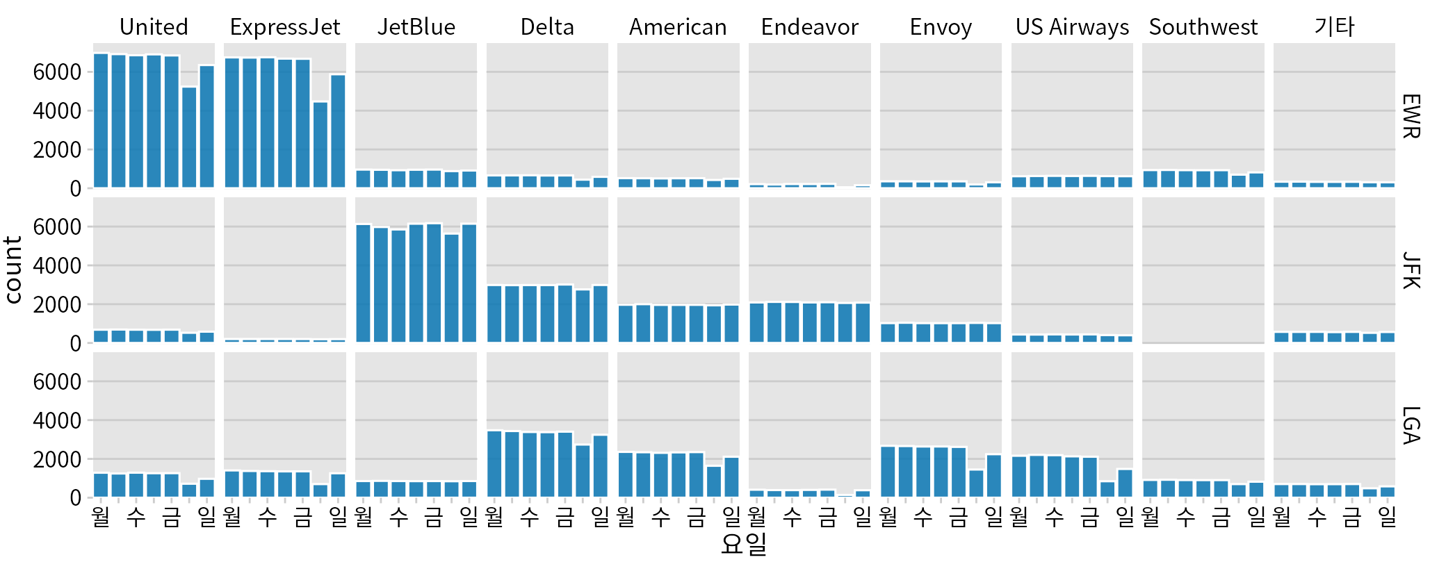 (ref:all-departures-weekdays) 2013년 뉴욕시 지역 공항 출발편, 항공사, 공항, 요일별 분류. 유나이티드 항공과 익스프레스젯이 뉴어크 공항(EWR) 출발편의 대부분을 차지하고, 젯블루, 델타, 아메리칸, 엔데버가 JFK 출발편의 대부분을 차지하며, 델타, 아메리칸, 엔보이, US 에어웨이스가 라과디아(LGA) 출발편의 대부분을 차지합니다. 모든 항공사는 아니지만 대부분의 항공사는 주중보다 주말에 출발편이 적습니다. 데이터 출처: 미국 교통부, 교통 통계국.