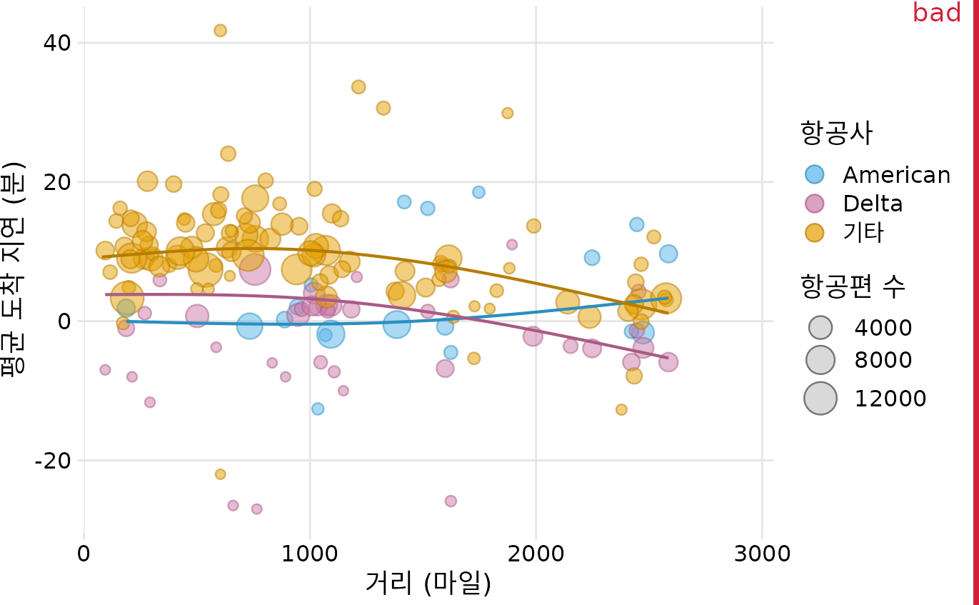 (ref:arrival-delay-vs-distance) 뉴욕시로부터의 거리 대 평균 도착 지연. 각 점은 하나의 목적지를 나타내며 각 점의 크기는 2013년 뉴욕시 3개 주요 공항(뉴어크, JFK 또는 라과디아) 중 하나에서 해당 목적지까지의 항공편 수를 나타냅니다. 음의 지연은 항공편이 일찍 도착했음을 의미합니다. 실선은 도착 지연과 거리 간의 평균 추세를 나타냅니다. 델타 항공은 이동 거리에 관계없이 다른 항공사보다 도착 지연이 지속적으로 낮습니다. 아메리칸 항공은 단거리의 경우 평균적으로 지연이 가장 낮지만 장거리의 경우 지연이 가장 높습니다. 이 그림은 지나치게 복잡하기 때문에 “나쁨”으로 표시되었습니다. 대부분의 독자는 혼란스러워하며 그림이 무엇을 보여주는지 직관적으로 파악하지 못할 것입니다. 데이터 출처: 미국 교통부, 교통 통계국.