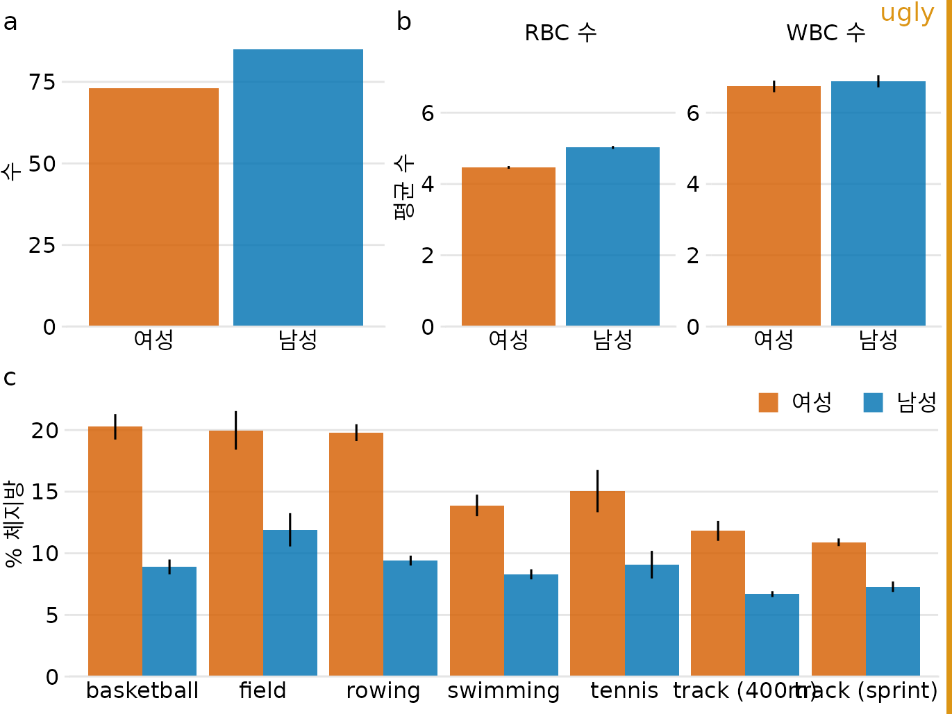 (ref:athletes-composite-repetitive) 남성 및 여성 운동선수의 생리학 및 신체 구성. 오차 막대는 평균의 표준 오차를 나타냅니다. 이 그림은 지나치게 반복적입니다. 그림 ?fig-athletes-composite-good과 동일한 데이터를 보여주고 일관된 시각적 언어를 사용하지만 모든 하위 그림은 동일한 유형의 시각화(막대 그래프)를 사용합니다. 이로 인해 독자가 (a), (b), (c) 부분이 완전히 다른 결과를 보여준다는 것을 처리하기 어렵습니다. 데이터 출처: Telford and Cunningham (1991)