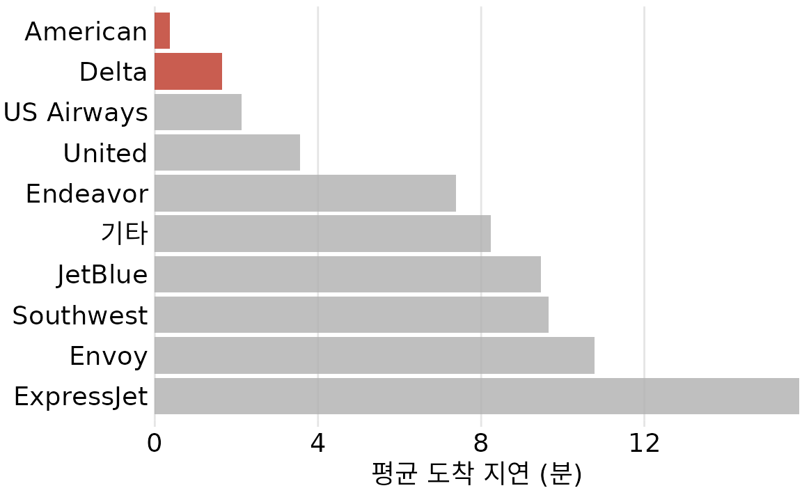 (ref:mean-arrival-delay-nyc) 2013년 뉴욕시 지역 출발 항공편의 항공사별 평균 도착 지연. 아메리칸 항공과 델타 항공은 뉴욕시 지역 출발 모든 항공사 중 평균 도착 지연이 가장 낮습니다. 데이터 출처: 미국 교통부, 교통 통계국.