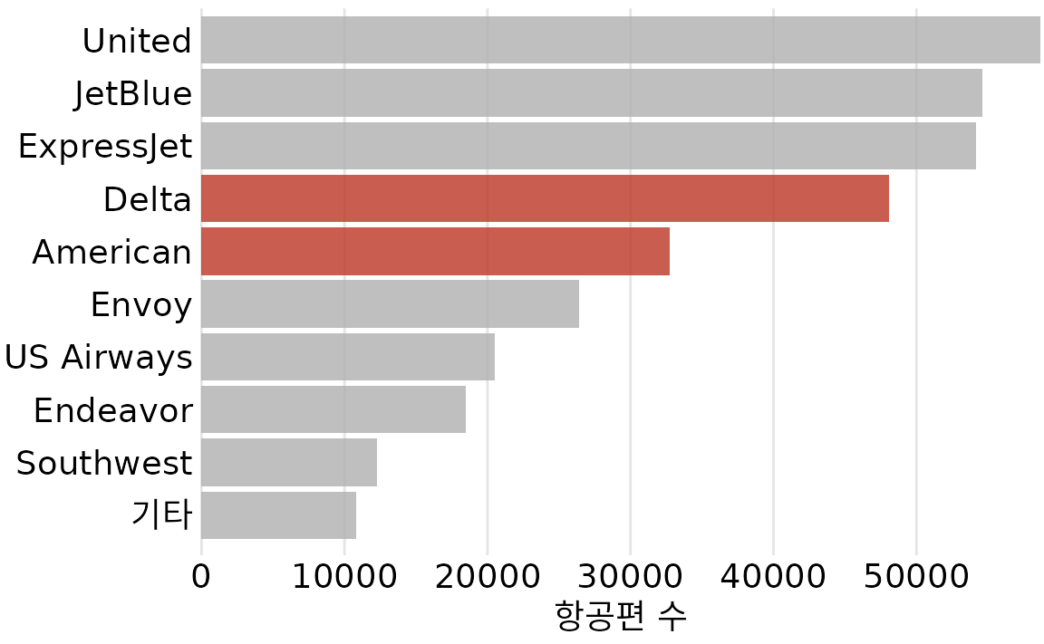 (ref:number-of-flights-nyc) 2013년 뉴욕시 지역 출발 항공편 수, 항공사별. 델타 항공과 아메리칸 항공은 뉴욕시 지역 출발 항공편 수 기준으로 각각 4위와 5위 항공사입니다. 데이터 출처: 미국 교통부, 교통 통계국.