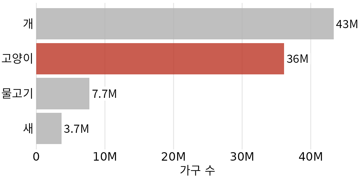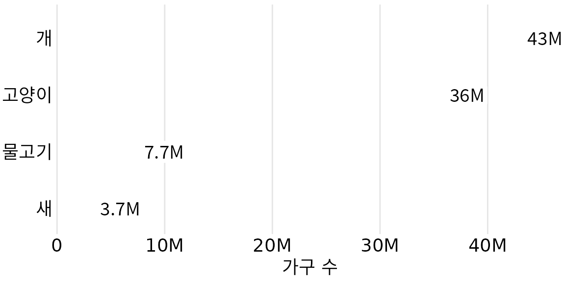 (ref:petownership-isotype) 가장 인기 있는 애완동물 중 하나 이상을 키우는 가구 수, 아이소타이프 그래프로 표시. 각 완전한 동물은 해당 종류의 애완동물을 키우는 500만 가구를 나타냅니다. 데이터 출처: 2012년 미국 애완동물 소유 및 인구 통계 자료집, 미국 수의학 협회