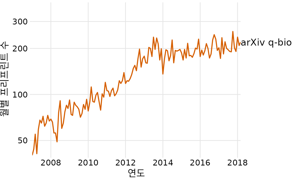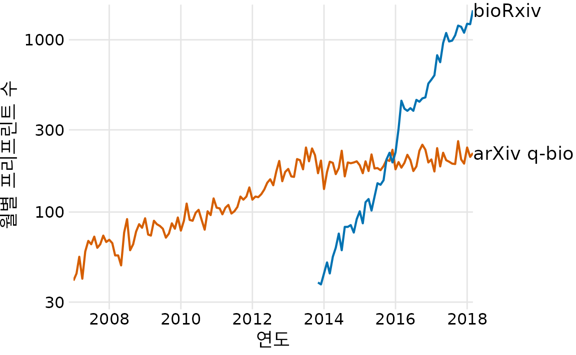 이것이 생물학의 프리프린트에 대한 제 이야기입니다. 첫 번째 그림(그림 Figure 31.1)이 두 번째 그림(그림 Figure 31.2)에 완전히 포함되어 있음에도 불구하고 의도적으로 두 개의 그림으로 이야기를 전달했습니다. 저는 이 이야기가 두 부분으로 나뉘었을 때 가장 강력한 영향을 미친다고 생각하며 이것이 제가 강연에서 발표하는 방식입니다. 그러나 그림 ?fig-q-bio-bioRxiv-monthly-growth만으로도 전체 이야기를 전달할 수 있으며 단일 그림 버전은 소셜 미디어 게시물과 같이 청중의 주의 집중 시간이 짧을 것으로 예상되는 매체에 더 적합할 수 있습니다.