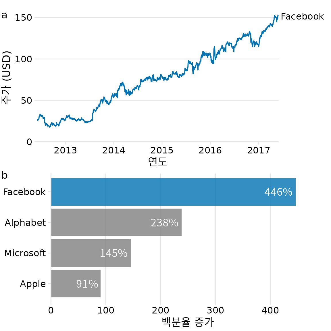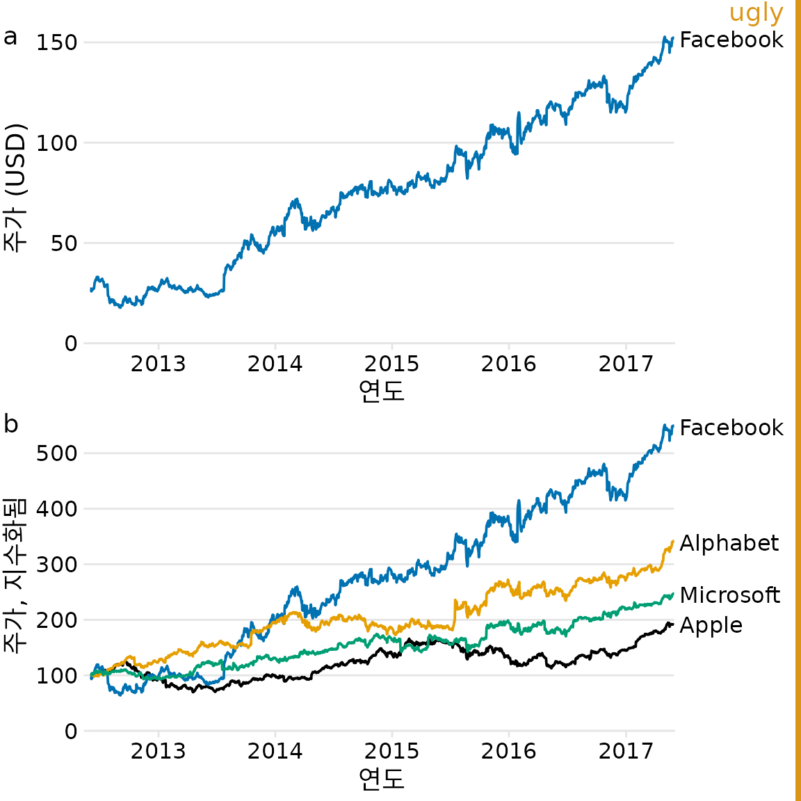 반복적인 그림 세트는 종종 각 부분이 동일한 유형의 원시 데이터를 기반으로 하는 다중 부분 이야기의 결과입니다. 이러한 시나리오에서는 각 부분에 대해 동일한 유형의 시각화를 사용하고 싶은 유혹이 들 수 있습니다. 그러나 전체적으로 이러한 그림은 청중의 주의를 끌지 못합니다. 예를 들어 페이스북 주식에 대한 이야기를 두 부분으로 나누어 생각해 보겠습니다. (i) 페이스북 주가는 2012년부터 2017년까지 급격히 상승했습니다. (ii) 주가 상승은 다른 대형 기술 회사의 주가 상승을 앞질렀습니다. 그림 ?fig-tech-stocks-repetitive에 표시된 것처럼 시간 경과에 따른 주가를 보여주는 두 개의 그림으로 이러한 두 가지 진술을 시각화하고 싶을 수 있습니다. 그러나 그림 Figure 31.11 (a)는 명확한 목적을 수행하며 그대로 유지해야 하지만 그림 Figure 31.11 (b)는 동시에 반복적이며 요점을 모호하게 만듭니다. 우리는 알파벳, 애플, 마이크로소프트의 주가의 정확한 시간적 진화에 특별히 관심이 있는 것이 아니라 페이스북의 주가보다 덜 성장했다는 점을 강조하고 싶을 뿐입니다.