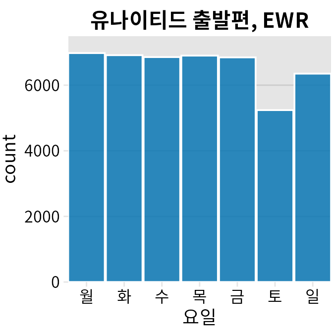 (ref:united-departures-weekdays) 2013년 뉴어크 공항(EWR)에서 출발하는 유나이티드 항공편, 요일별. 대부분의 요일은 거의 동일한 수의 출발편을 보이지만 주말에는 출발편이 더 적습니다. 데이터 출처: 미국 교통부, 교통 통계국.