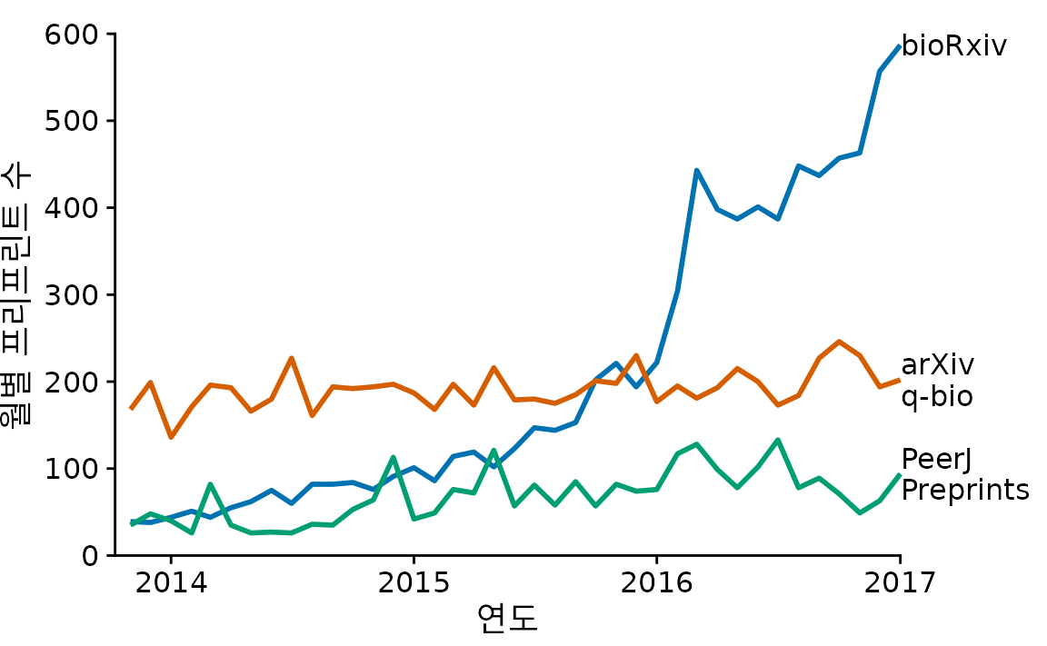 (ref:bio-preprints-direct-label) 선에 직접 레이블을 달아 범례를 확인하는 수고를 덜어준 최종 그래프. 점을 제거해 시각적인 복잡도도 줄였습니다.