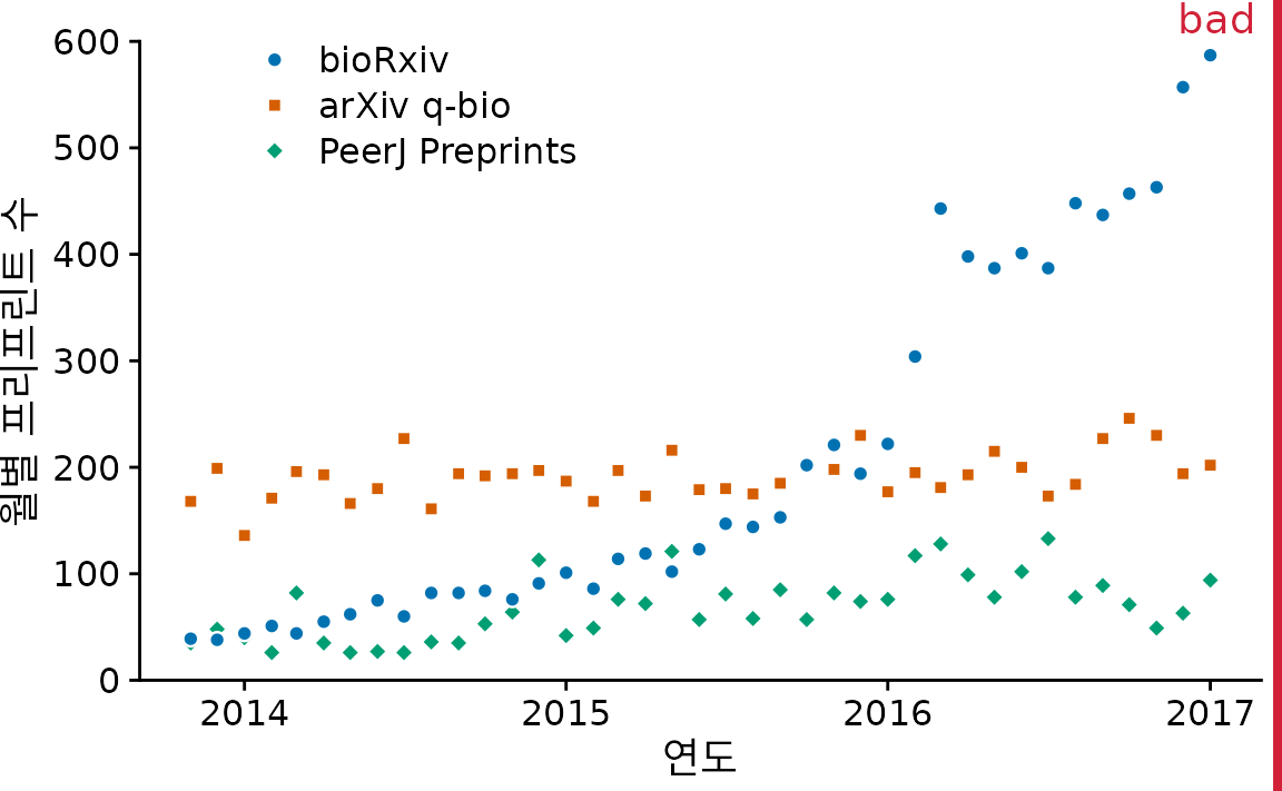 그림 ?fig-bio-preprints-lines도 나쁘지 않지만, 별도의 범례(legend)는 독자에게 “이 색은 뭐였지?” 하고 눈을 돌리게 만드는 불편함을 줍니다. 선 끝에 직접 레이블을 달아주면(그림 Figure 15.7) 굳이 범례를 찾아볼 필요가 없습니다. 점까지 아예 제거해서 선의 흐름만 남기면, 복잡한 데이터라도 아주 선명하고 읽기 편한 그래프가 됩니다.