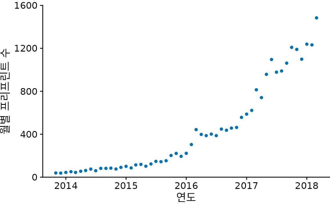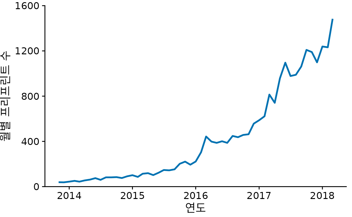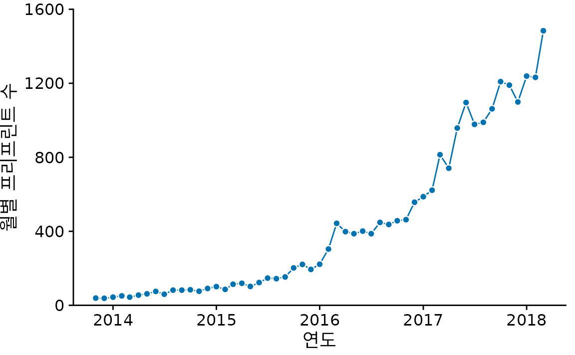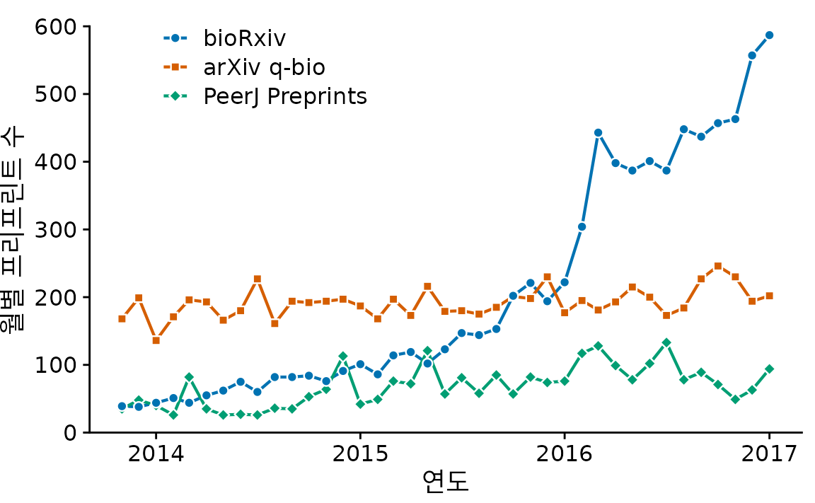 사실 시계열 데이터에서는 선만 남기고 점을 아예 없애는 것이 매우 흔한 관행입니다(그림 Figure 15.3). 점을 빼면 개별 데이터 하나하나보다는 전반적인 ’추세’에 시선이 더 집중됩니다. 그래프가 훨씬 깔끔해 보이기도 하죠. 데이터가 촘촘할수록 개별 점의 중요도는 낮아지므로, bioRxiv 데이터처럼 시계열이 긴 경우에는 선만 그리는 것이 더 나을 수 있습니다.