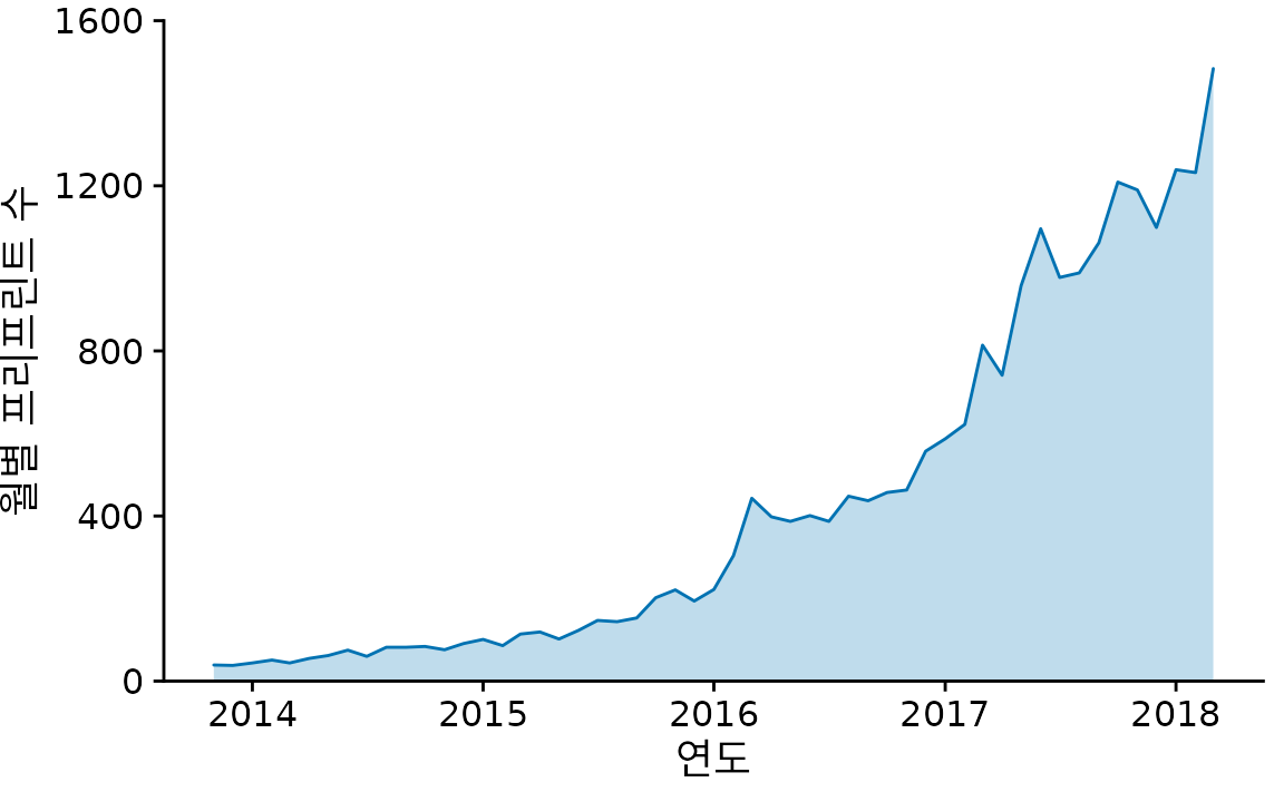 선 아래쪽을 색으로 채워 넣는 방법도 있습니다(그림 Figure 15.4). 이렇게 하면 데이터가 차지하는 ’면적’이 도드라져 전반적인 규모 변화가 훨씬 실감 나게 느껴집니다. 다만, 이 방식은 y축이 반드시 0부터 시작해야 하며, 데이터값이 모두 양수여야 왜곡이 없습니다.
