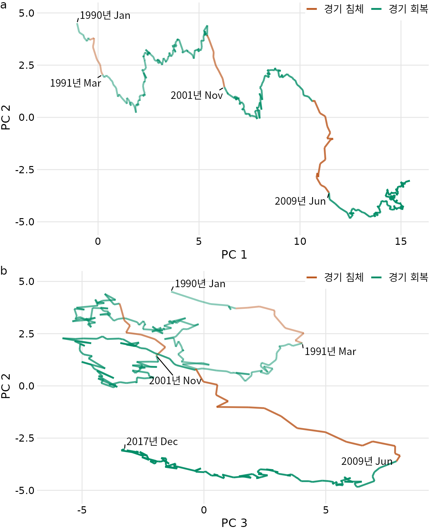 (ref:fred-md-PCA) 주성분 공간에서 연결된 산점도로 고차원 시계열 시각화. 경로는 1990년 1월부터 2017년 12월까지 100개 이상의 거시경제 지표의 공동 움직임을 나타냅니다. 경기 침체 및 회복 시기는 색상으로 표시되며 세 번의 경기 침체 종료 지점(1991년 3월, 2001년 11월, 2009년 6월)도 레이블로 표시됩니다. (a) PC 2 대 PC 1. (b) PC 2 대 PC 3. 데이터 출처: M. W. McCracken, 세인트루이스 연준