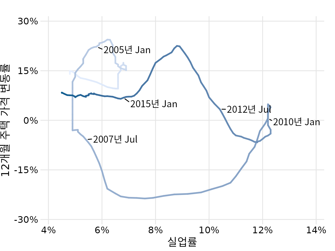 (ref:house-price-path) 주택 가격 변동률과 실업률의 관계를 보여주는 연결된 산점도. 색이 어두울수록 최근 데이터를 나타냅니다. 두 변수가 서로 반대 방향으로 움직이면서 시계 반대 방향의 소용돌이 패턴을 형성합니다.