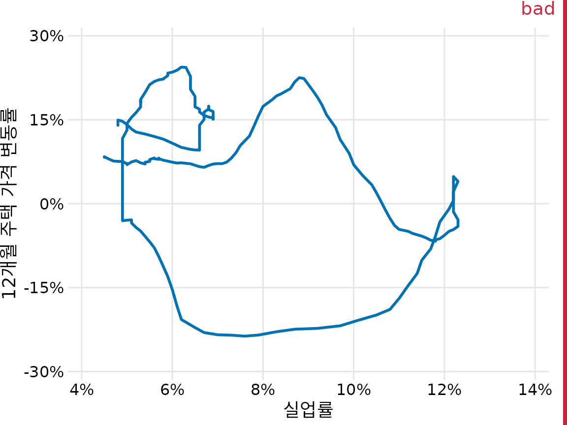 (ref:house-price-path-bad) 시간 흐름이나 방향 정보가 빠진 연결된 산점도. 데이터의 선후 관계를 알 수 없어 패턴을 해석하기 어렵기 때문에 “나쁨”으로 표시되었습니다.