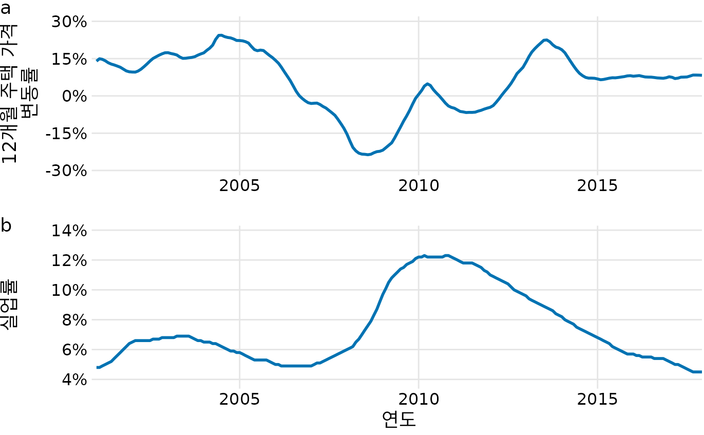 이 데이터를 두 개의 그래프를 위아래로 쌓아서 그릴 수도 있습니다(그림 Figure 15.9). 각각의 변화는 잘 보이지만, 두 변수를 서로 정밀하게 비교하기는 번거롭습니다. 실업률이 오를 때 집값이 내리는 시점을 찾으려면 위아래 그래프를 번갈아 보며 눈을 바쁘게 움직여야 하기 때문입니다.