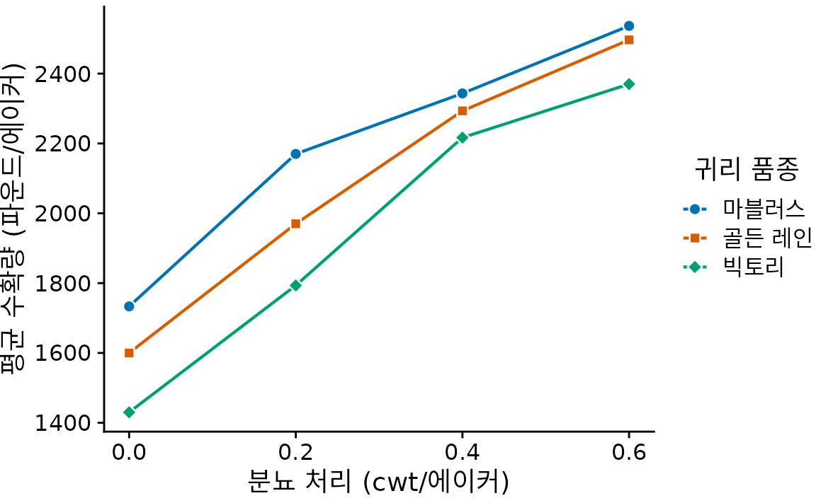 선 그래프는 ’시간’에만 국한되지 않습니다. x축에 놓인 변수에 따라 자연스러운 순서가 있다면 언제든 쓸 수 있습니다. 대표적인 사례가 약물이나 비료의 양을 늘릴 때 성능이 어떻게 변하는지 보여주는 용량-반응 곡선(dose-response curve)입니다. 그림 ?fig-oats-yield는 비료 투입량에 따른 귀리 수확량의 변화를 보여주는데, 세 품종 모두 비슷한 반응 곡선을 그리면서도 기초 체질(비료가 없을 때의 기본 수확량)에는 차이가 있음을 잘 보여줍니다.