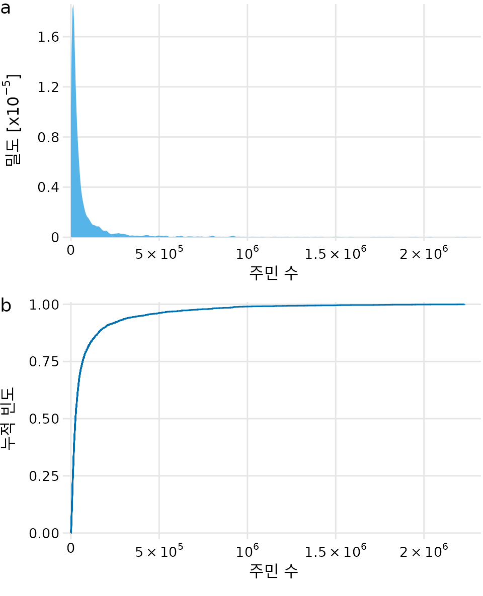(ref:county-populations) 2010년 미국 인구 조사에 따른 미국 카운티의 주민 수 분포. (a) 밀도 그림. (b) 경험적 누적 분포 함수.