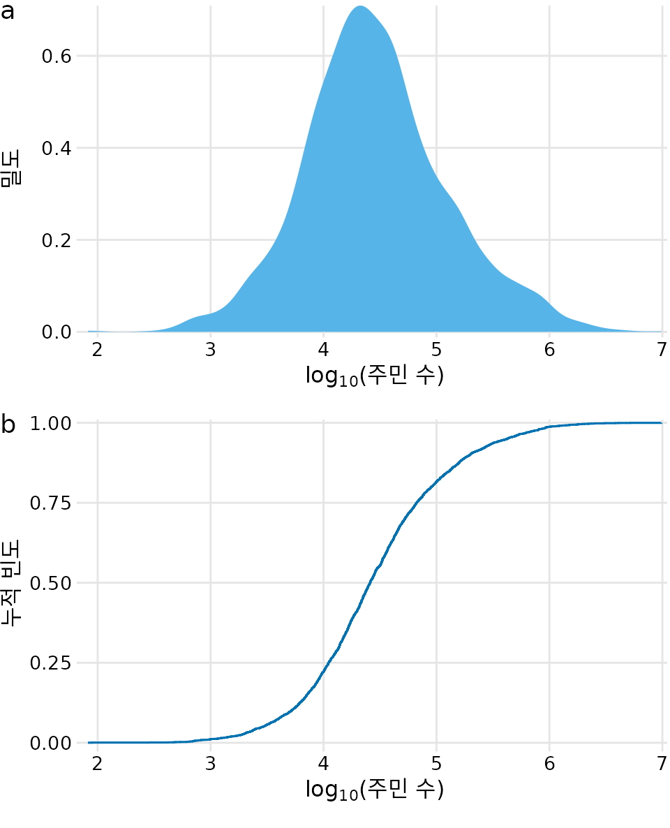 (ref:county-populations-log) 미국 카운티 주민 수의 로그 분포. (a) 밀도 그림. (b) 경험적 누적 분포 함수.