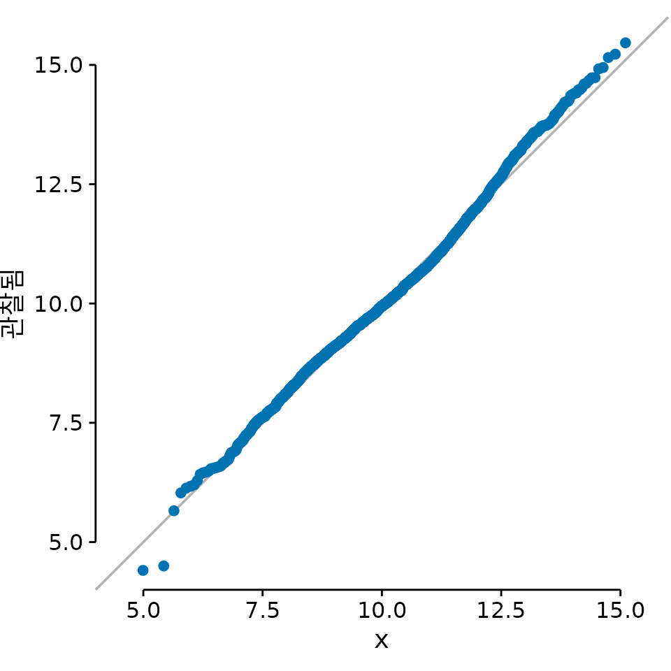 분위수-분위수(Q-Q) 그림은 실제 데이터가 특정 이론적 분포(대개 정규 분포)를 잘 따르고 있는지 확인하고 싶을 때 매우 유용한 도구입니다. ECDF와 마찬가지로 데이터를 순위순으로 나열하는 것이 기본이지만, 축의 기준이 다릅니다. Q-Q 그림은 데이터의 각 순위별 이론적인 예상값이 어디여야 하는지를 계산하여 이를 실제 관찰값과 직접 비교합니다. 예를 들어 평균이 10이고 표준편차가 3인 정규 분포라면, 상위 50%는 10에 있어야 하고, 84%는 13에, 하위 2.3%는 4에 있어야 합니다. 이런 식으로 모든 데이터 포인트를 ’이론적 값’과 ’실제 관찰값’으로 대응시켜 산점도를 그립니다.