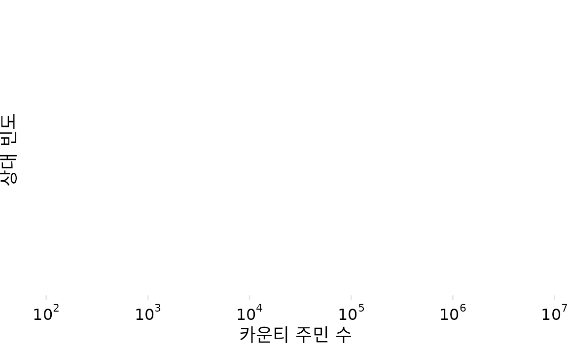 2010년 미국 인구 조사 데이터를 바탕으로 각 카운티(County)별 거주자 수를 살펴보겠습니다. 인구 분포가 매우 불균형한데, 대부분의 카운티는 주민 수가 적지만(중앙값 약 2만 5천 명), 로스앤젤레스 카운티처럼 인구가 1,000만 명에 육박하는 곳도 있습니다. 이런 데이터를 일반적인 밀도 그림이나 ECDF 그대로 그리면, 데이터의 특징을 전혀 읽어낼 수 없는 쓸모없는 그래프가 됩니다(그림 Figure 10.4).