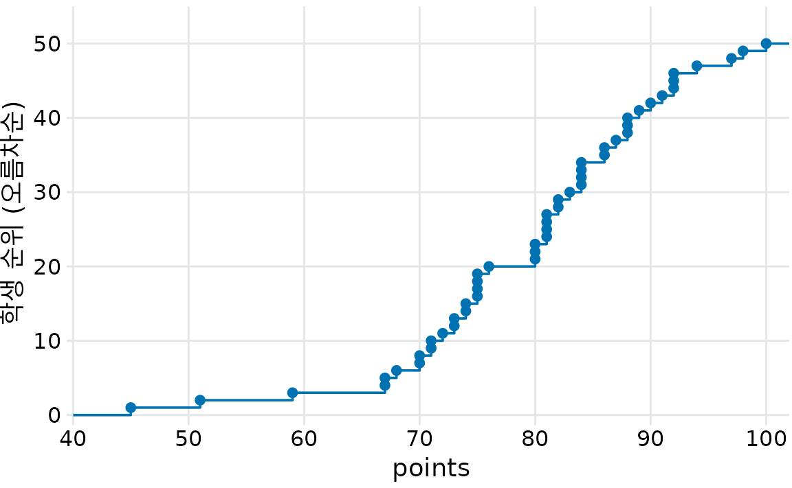 가장 낮은 점수부터 한 명씩 학생들의 순위를 매겨본다고 합시다. 특정 점수 이하를 받은 학생의 총 인원수를 해당 점수와 짝지어 그래프로 그리면, 0점에서 시작해 100점에서 인원수 50명으로 끝나는 오름차순 그래프가 됩니다. 이것이 바로 경험적 누적 분포 함수(ECDF) 혹은 간단히 누적 분포입니다. 그래프의 각 점은 한 명의 학생을 나타내며, 선은 각 점수대별로 해당 점수 이하를 받은 학생들의 최대 순위를 연결한 것입니다(그림 Figure 10.1).